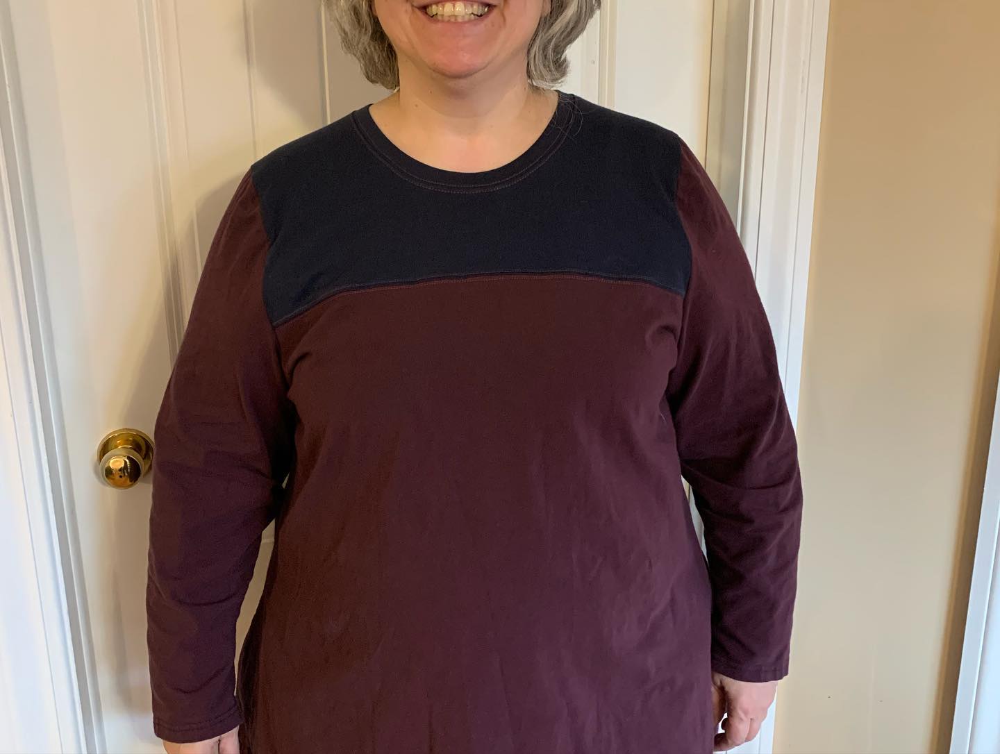 Tired of the shoulder seams and front neckline of my me made tee shirts going on walk about during the day. I will be applying a forward shoulder adjustment in all future makes. But fabric is expensive, so I unpicked the upper arms, and chopped top of tee shirt off, drafted new front and back yokes pieces with forward shoulder adjustment made. Then I combined front and back yoke pieces at shoulder seam, adding a seam down center of the back yoke. Seamless shoulders, color blocking, my new favorite rehabilitated tee shirt. #sewover50plus #sewover50