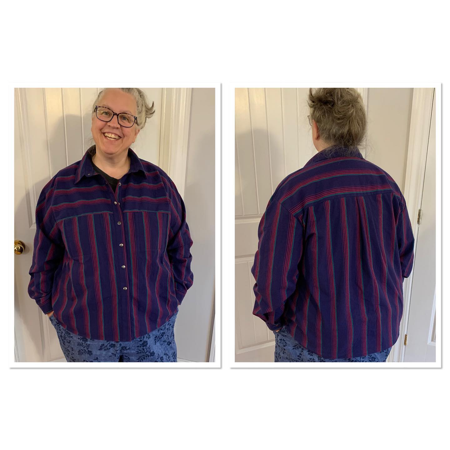 My first Olya shirt by Paper Theory. Love it. In apparel cotton. Unique construction. Not for beginners. Size 22 graded to 28 at hips. C:46 W:48 H:59 Hidden front chest pockets. Finished with snaps. #sewover50plus