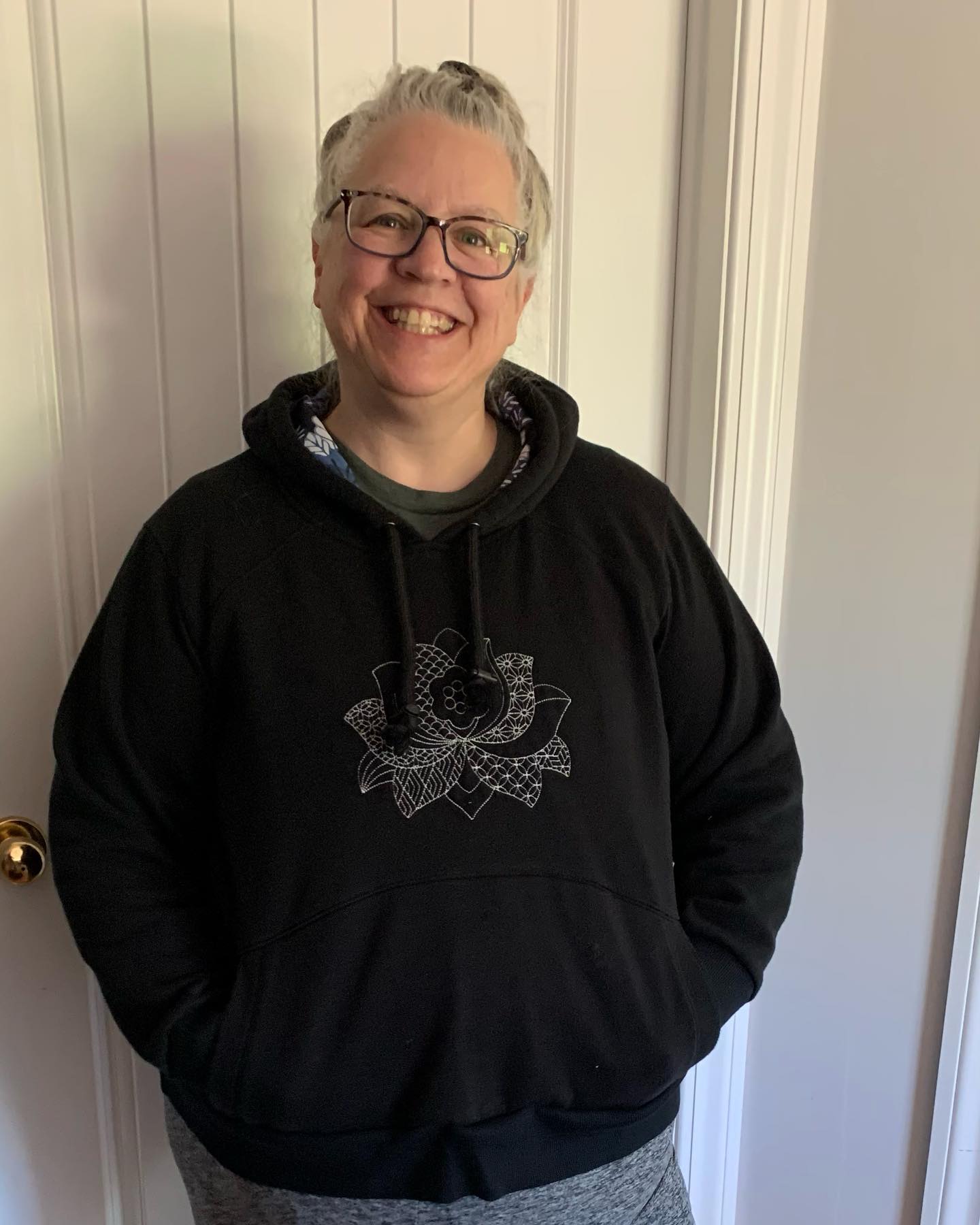 #MeMadeMay2023 day 18, woke to temps in the 30âs F, and morning workout, so here I am in Cashmerette Stanton hoodie, and Apostrophe Patterns leggings in brushed poly from Amandasbundles. Anxious from warmer temps. Happy Weekend All!