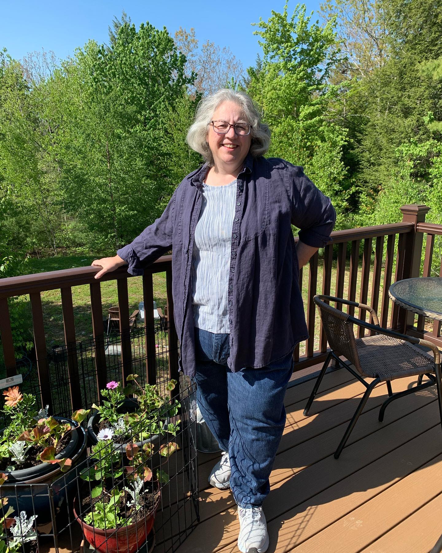 #MeMadeMay 2023 day 27, all me mades, Muna and Broad Noice jeans which I live in all winter. Self drafted linen shirt from Gray Lines Linen in NYC. Sleeveless self drafted striped shirt which was originally reversible but I found it too warm, and unpicked the two sides to make two separate shirts. Off for a day of yard sale shopping and dinner with the family.