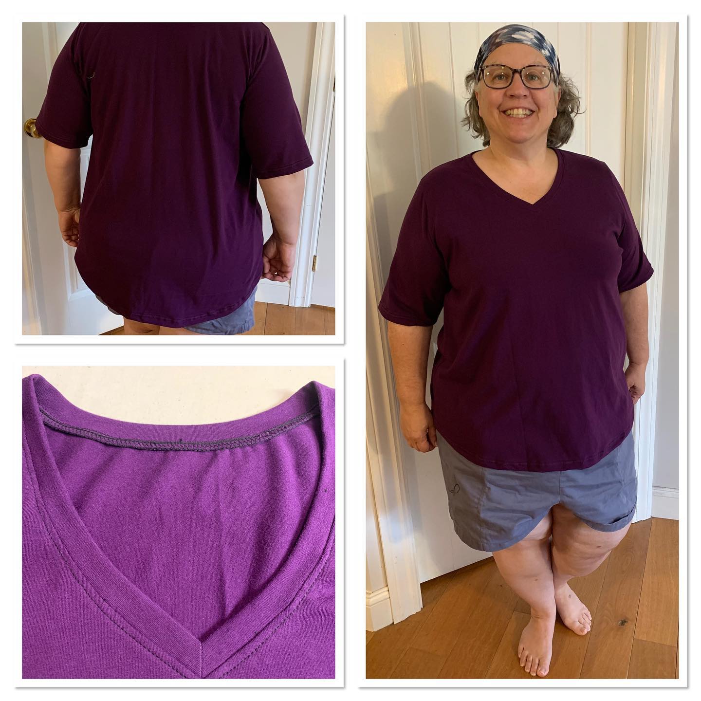 Who needs another Tee Shirt? I always ask myself why bother to make a tee when the RTW are so cheap⦠well, it fits in the shoulders, the v neck is perfect depth and width, the length of sleeve and shirt are always to my liking, and the color is always a guaranteed favorite. This is Peekaboo Pattern Shopâs Womenâs Essential Tee. I graded 3x chest to 5x waist and hips. But I also drafted the 5x sleeve onto 3x top. My measurements are 48 bust, 49 waist, 59 hips. Max measurements are 58 bust, 50 waist, 59 hips. Lots of options! Generous bicep on upper sleeve. Good instructions. #peekaboopatternshop #sewover50plus