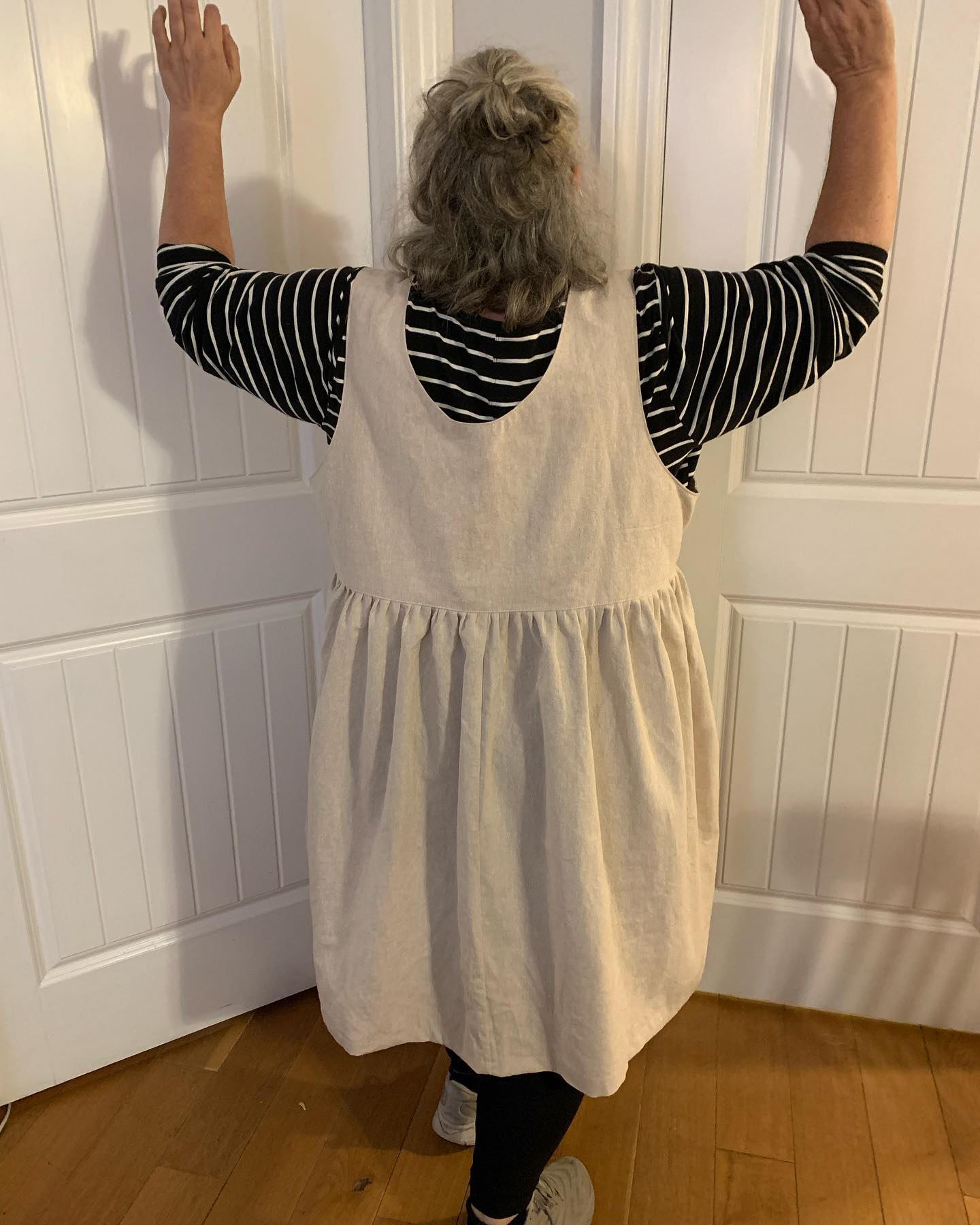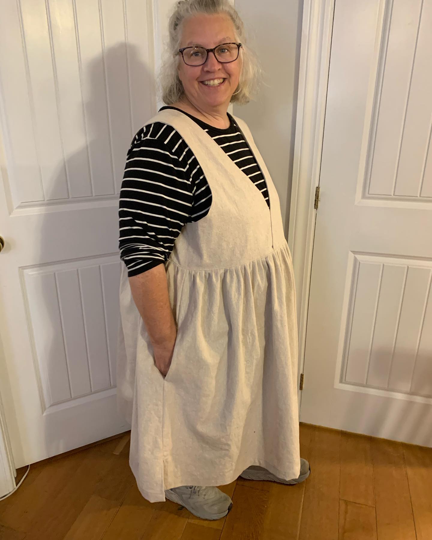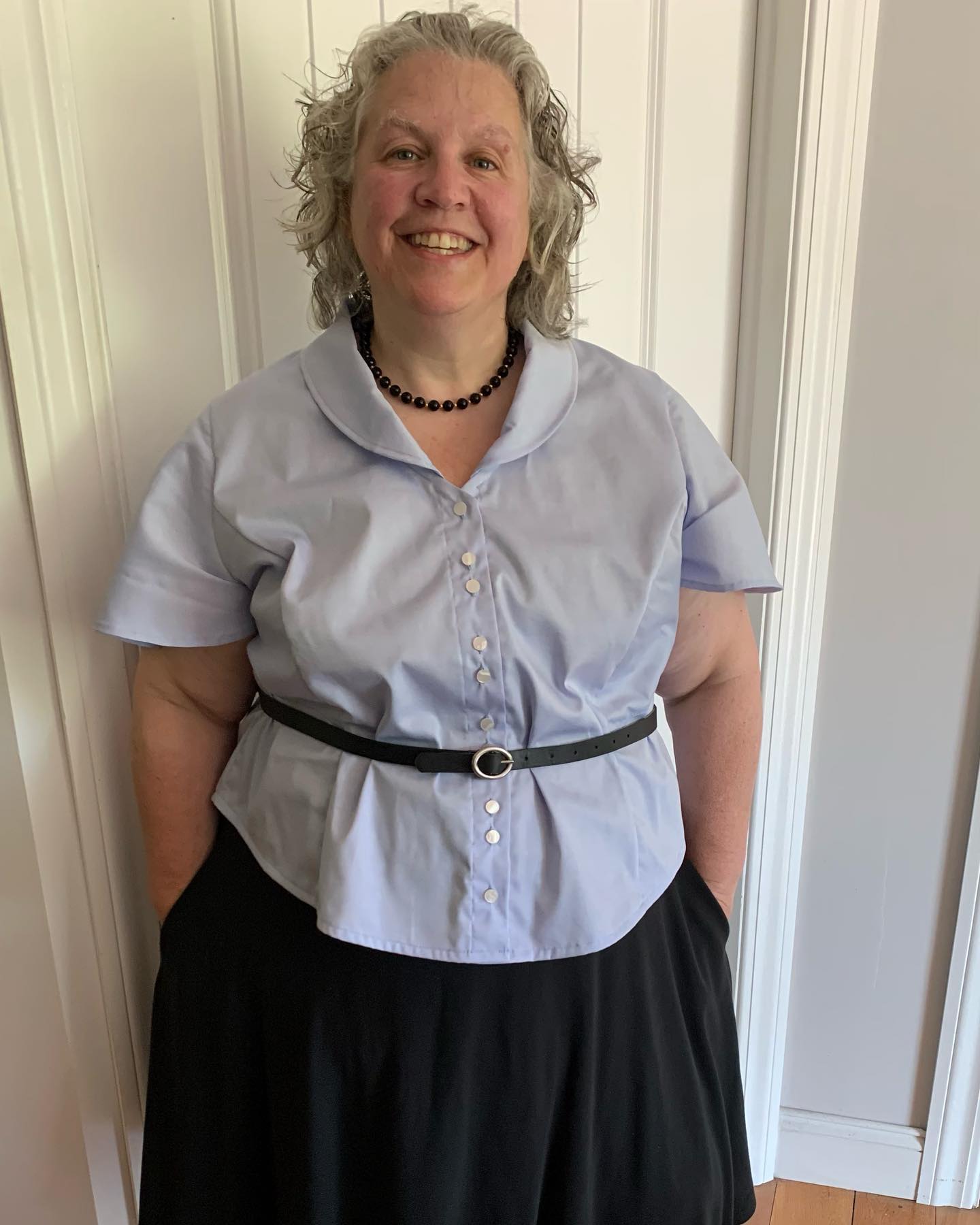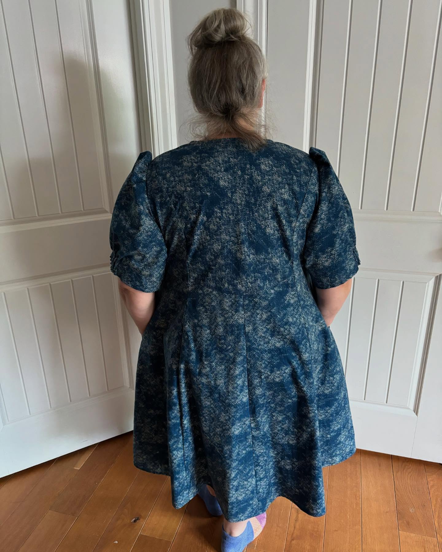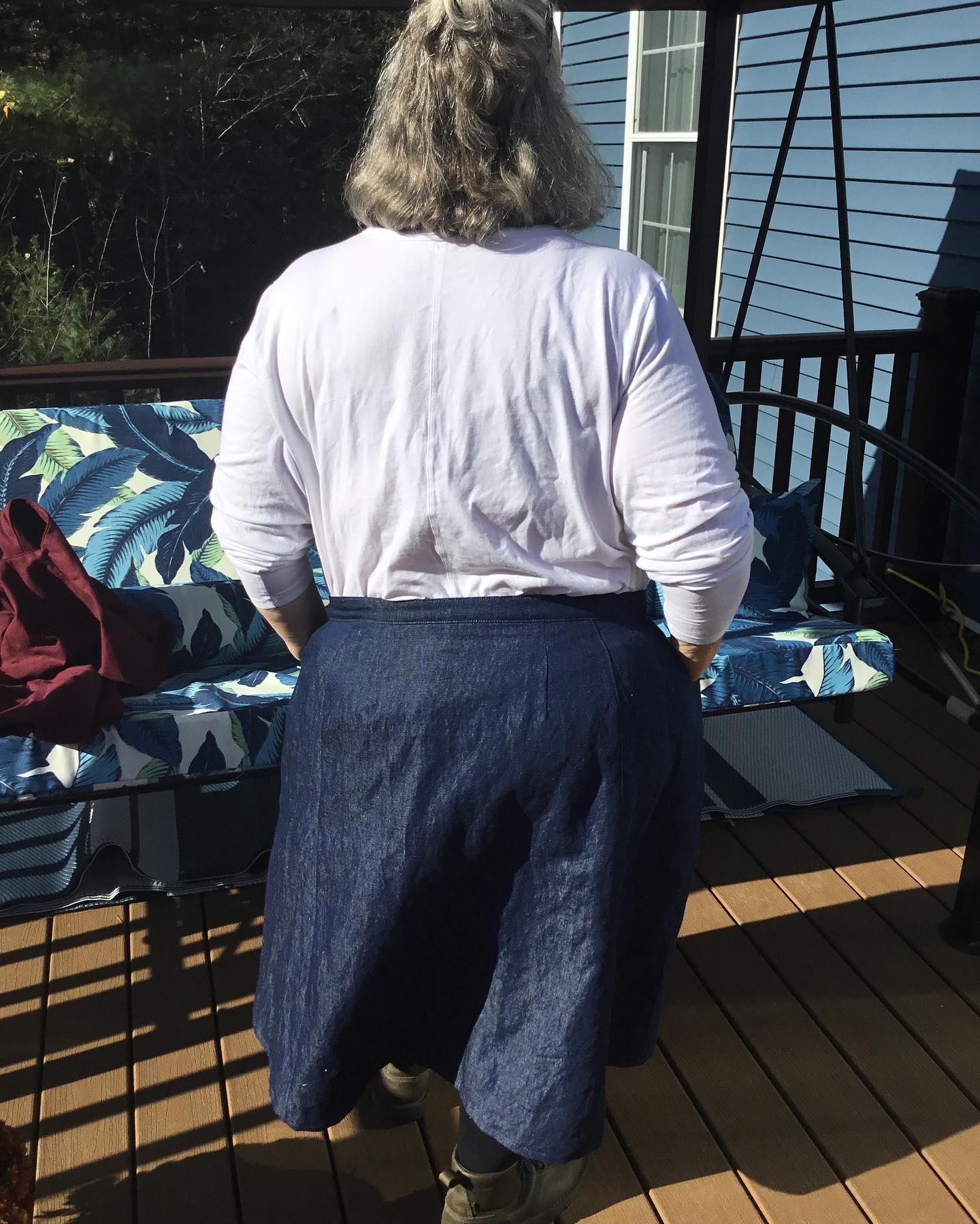 My make is made with a lightweight slightly shiny denim tencel. The fabric was a bit slippery and tended to fray, which added a bit of challenge. The flat piping is cut on cross grain which with this fabric tends to make it seem like a slightly a different color. I chose to do a front slit. The button placket is wonderful. The pockets are amazing. The flat piping in the seams adds a bit of structure to this flowy fabric, making the skirt skim over the body, and move wonderfully. The construction was straight forward and I would rate it for an intermediate sewist. If you are looking to dig into a bit of a challenge and need a wardrobe staple, this pattern could be for you. This is a straight size O. I am 5’4″ so it is a bit longer than intended.