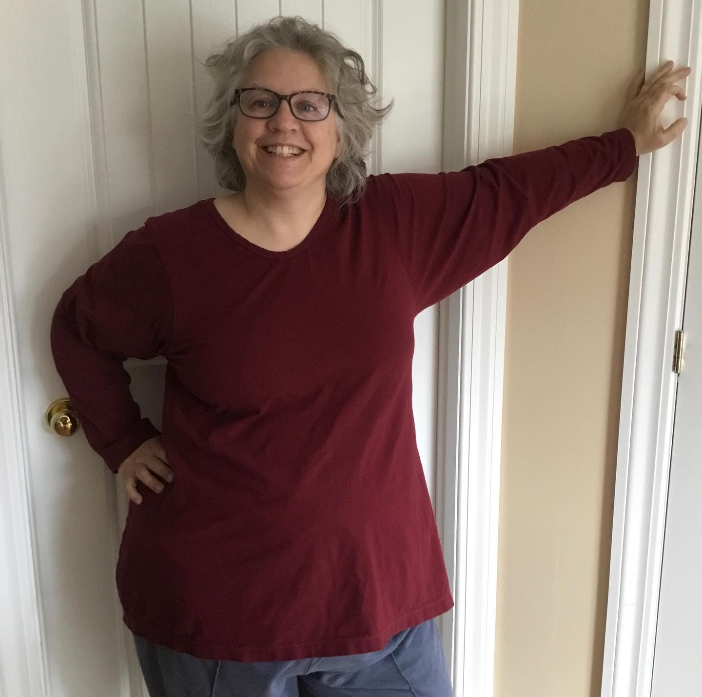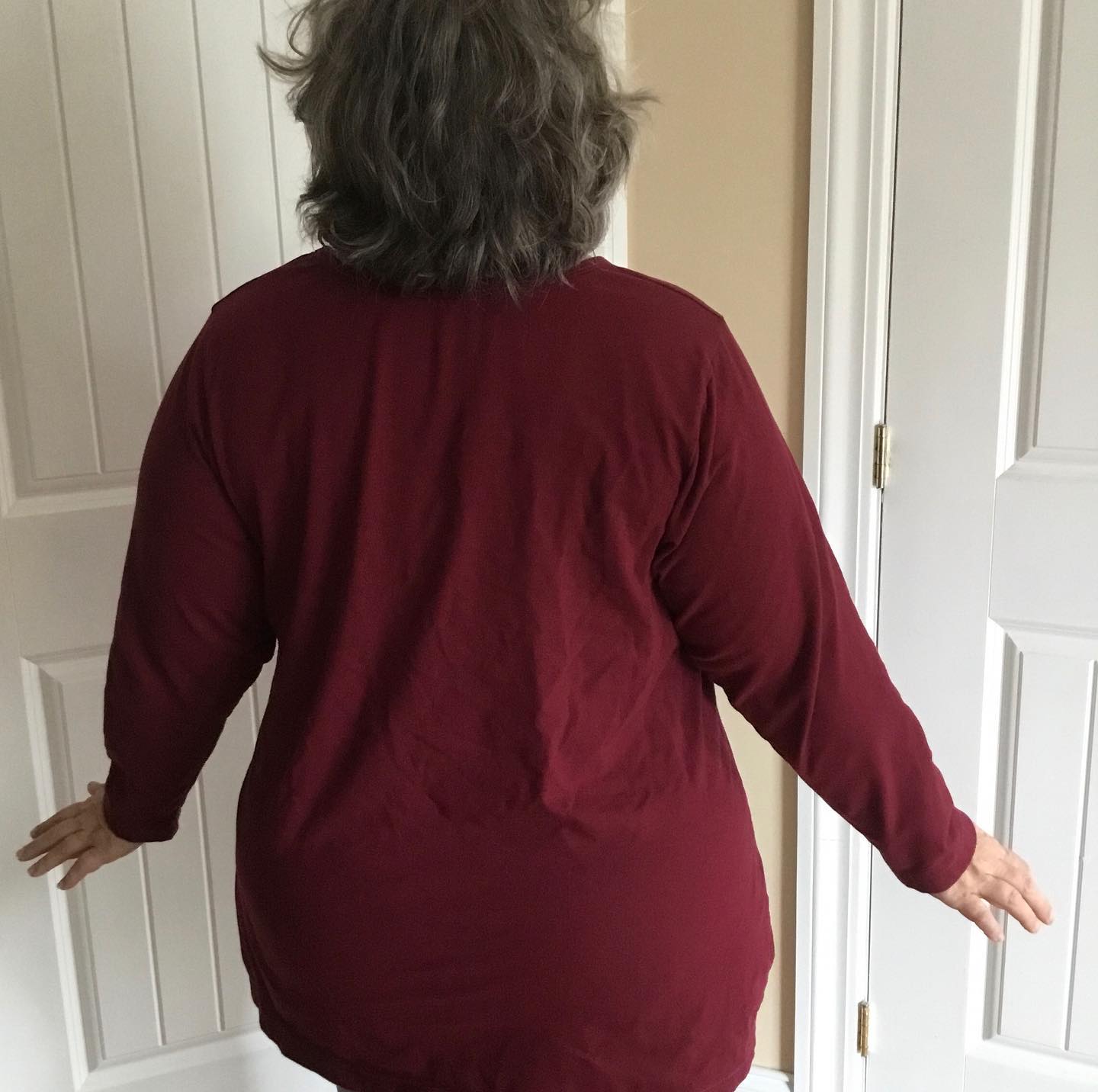 This is Apostrophe Patternâs MyFit Tee shirt in KnitFabric.comâs cotton Lycra – maroon. After entering many measurements, a custom pattern was generated to my specific measurements. I choose relaxed fit with low crew neck and long sleeves. Really gorgeous comfortable fit. I used my double fold knit binder attachment on my cover stitch machine for FIRST time. After an entire day of experimentation and practice, I ended up with a passable neckline. Measurements are C cup, bust 46, waist 49, hips 57. #pfbondage #fatsewover50 #sewover50plus