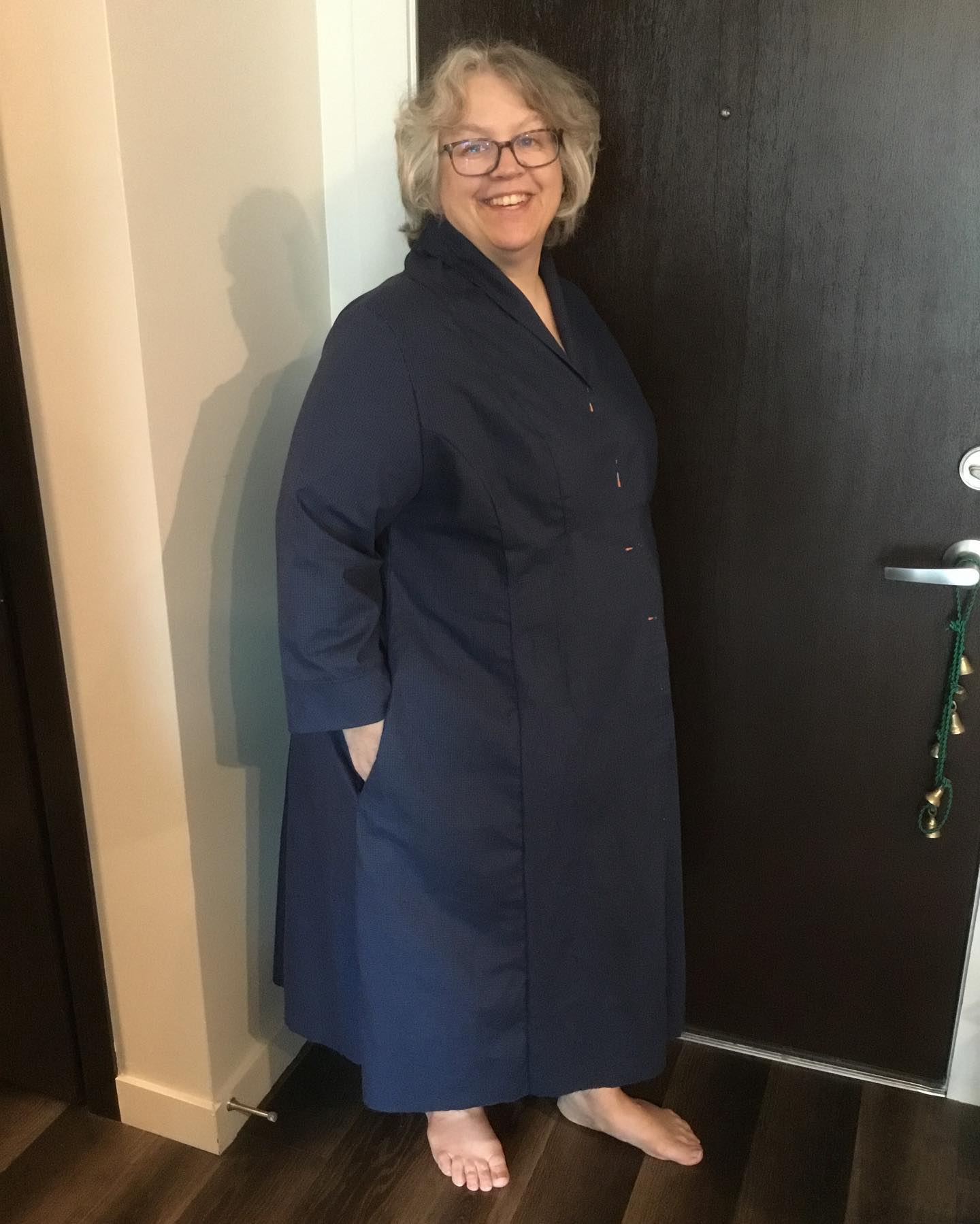 Here is my Stokx Shirtdress, in progress shot. I really love the design of this dress. I think it really works with my curves. Although, the construction is different in a few areas, it is cool. The one area, I am struggling a bit is with bicep. Even after grading up 3 sizes for my bicep, the still fit is good, but, not enough ease for comfortable movement. I am going to do full bicep adjustment to the sleeve, and try again. This is pretty typical as my biceps are proportionally bigger. This dress is worth it, with its modern design lines. Also, these are 3/4 sleeves which I will shorten a couple of inches.I love the wild shawl like collar, the pockets are perfect. The front yoke is perfect shaping and area for potential embellishment. The back shaping falls so nicely over my curves. This is going to be so comfortable. Also versatile, as it can be worn as dress or duster. #sewover50plus #stokxpatterns #fatsewover50