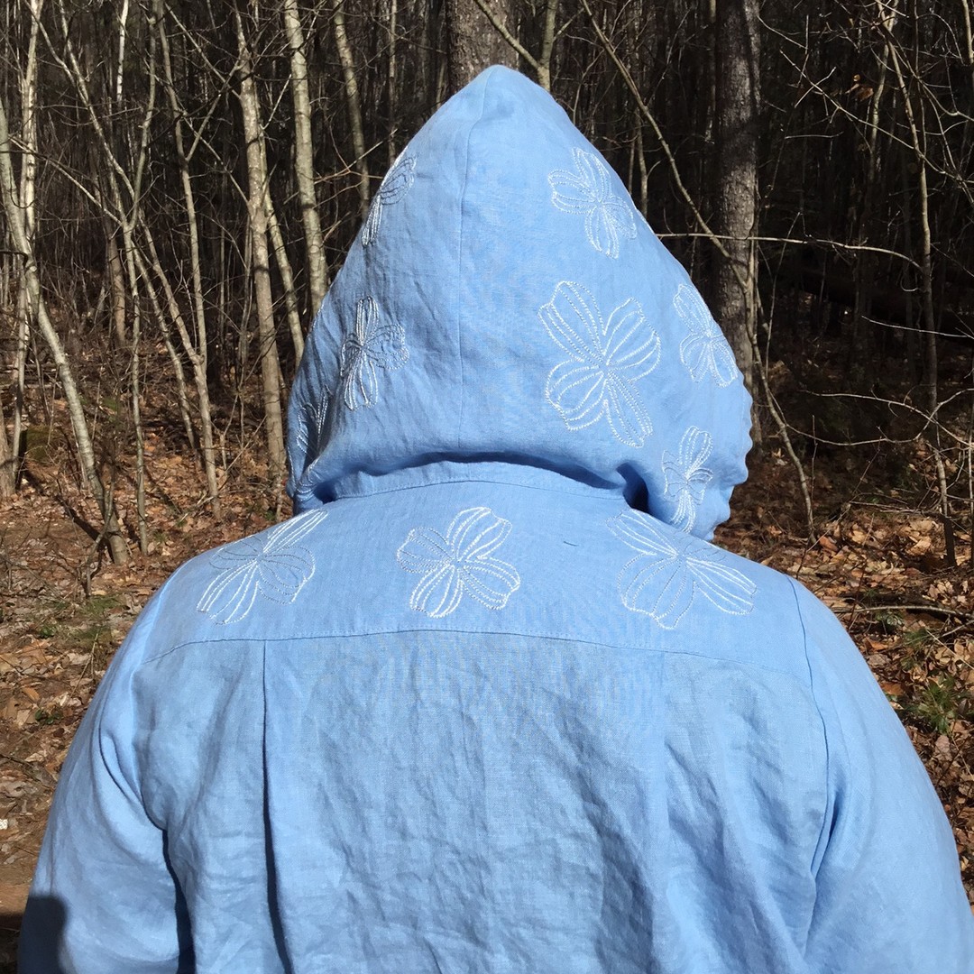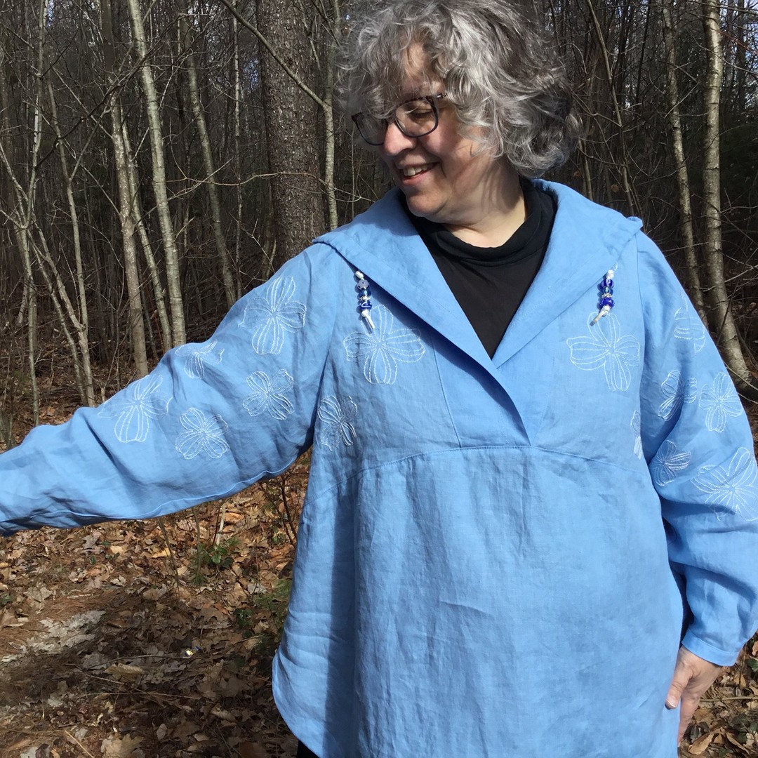 I self-drafted this pattern, digitized the embroidery, and made this Embroidered Linen Hoodie. I cannot stop smiling. This was inspired by a Jalie pattern which is not offered in my size range, and the sleeves are from Cashmerette’s new pattern, the Vernon shirt with full bicep option for C cup in view A. This is my entry for Round 1 in PatternReview Sewing Bee 2022 Contest. #sewover50 #sewover50plus #fatsewover50