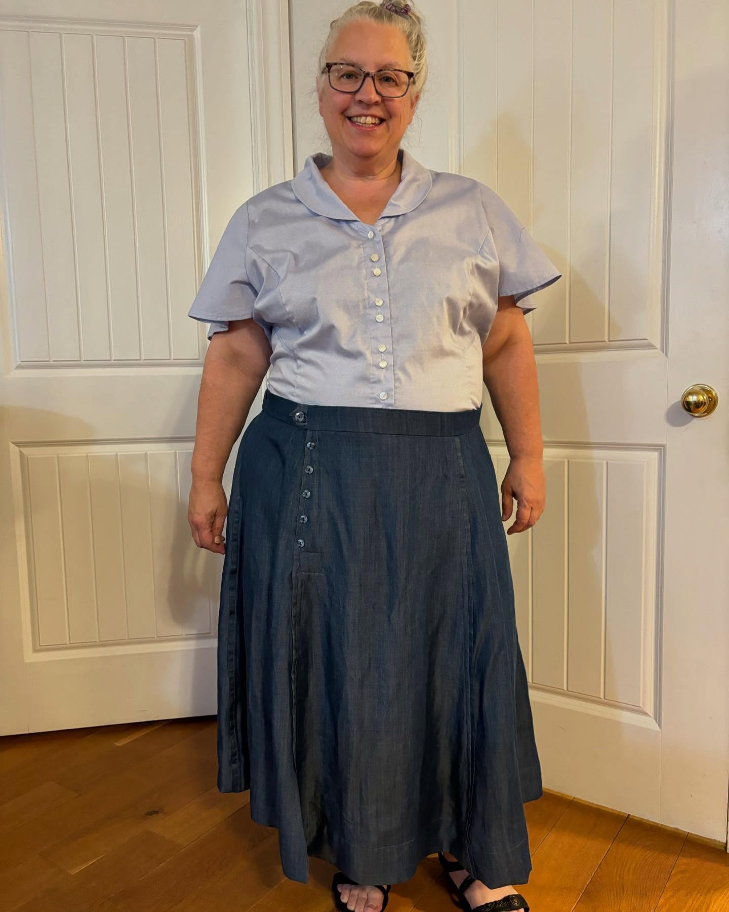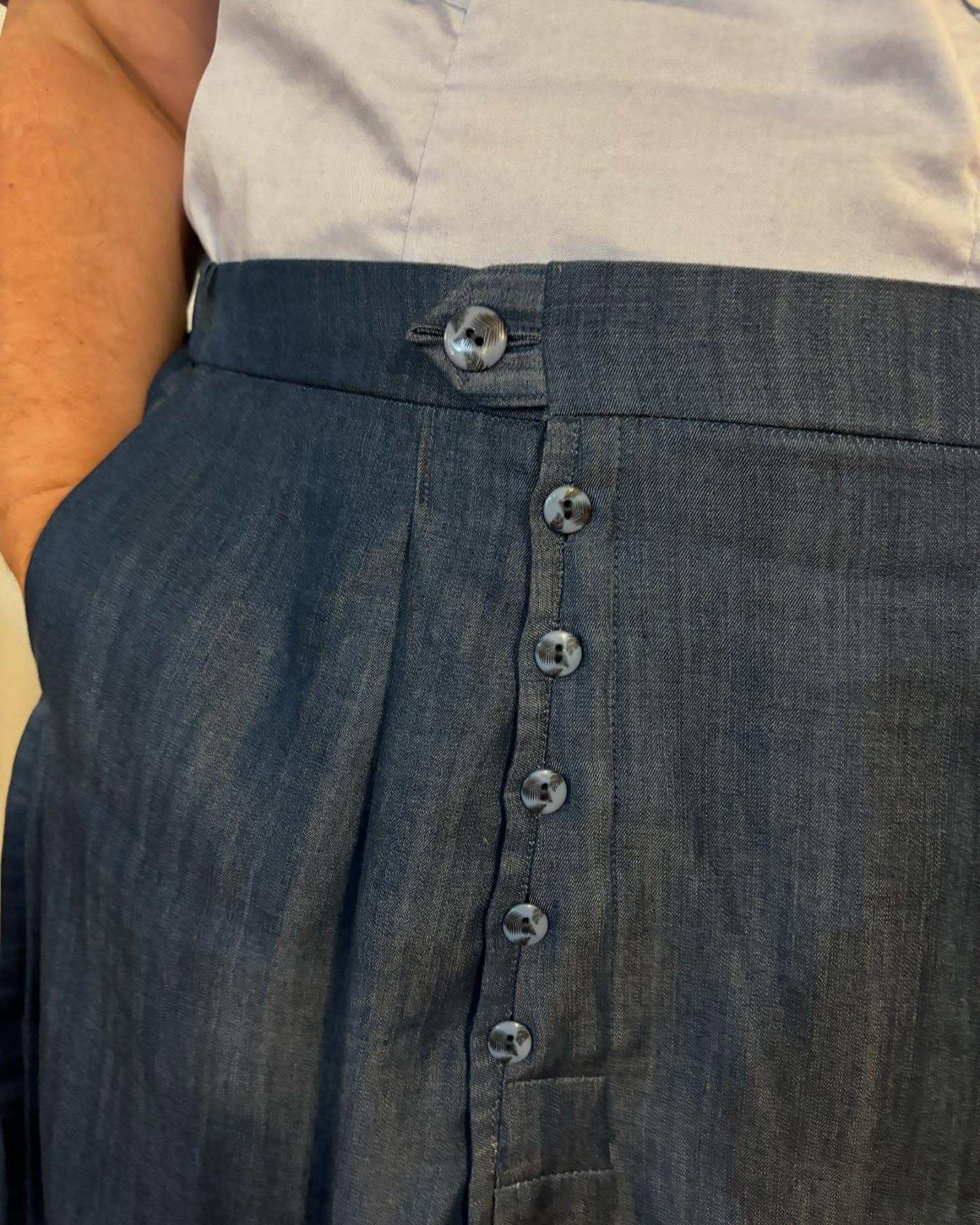My make is made with a lightweight slightly shiny denim tencel. The fabric was a bit slippery and tended to fray, which added a bit of challenge. The flat piping is cut on cross grain which with this fabric tends to make it seem like a slightly a different color. I chose to do a front slit. The button placket is wonderful. The pockets are amazing. The flat piping in the seams adds a bit of structure to this flowy fabric, making the skirt skim over the body, and move wonderfully. The construction was straight forward and I would rate it for an intermediate sewist. If you are looking to dig into a bit of a challenge and need a wardrobe staple, this pattern could be for you. This is a straight size O. I am 5’4″ so it is a bit longer than intended.