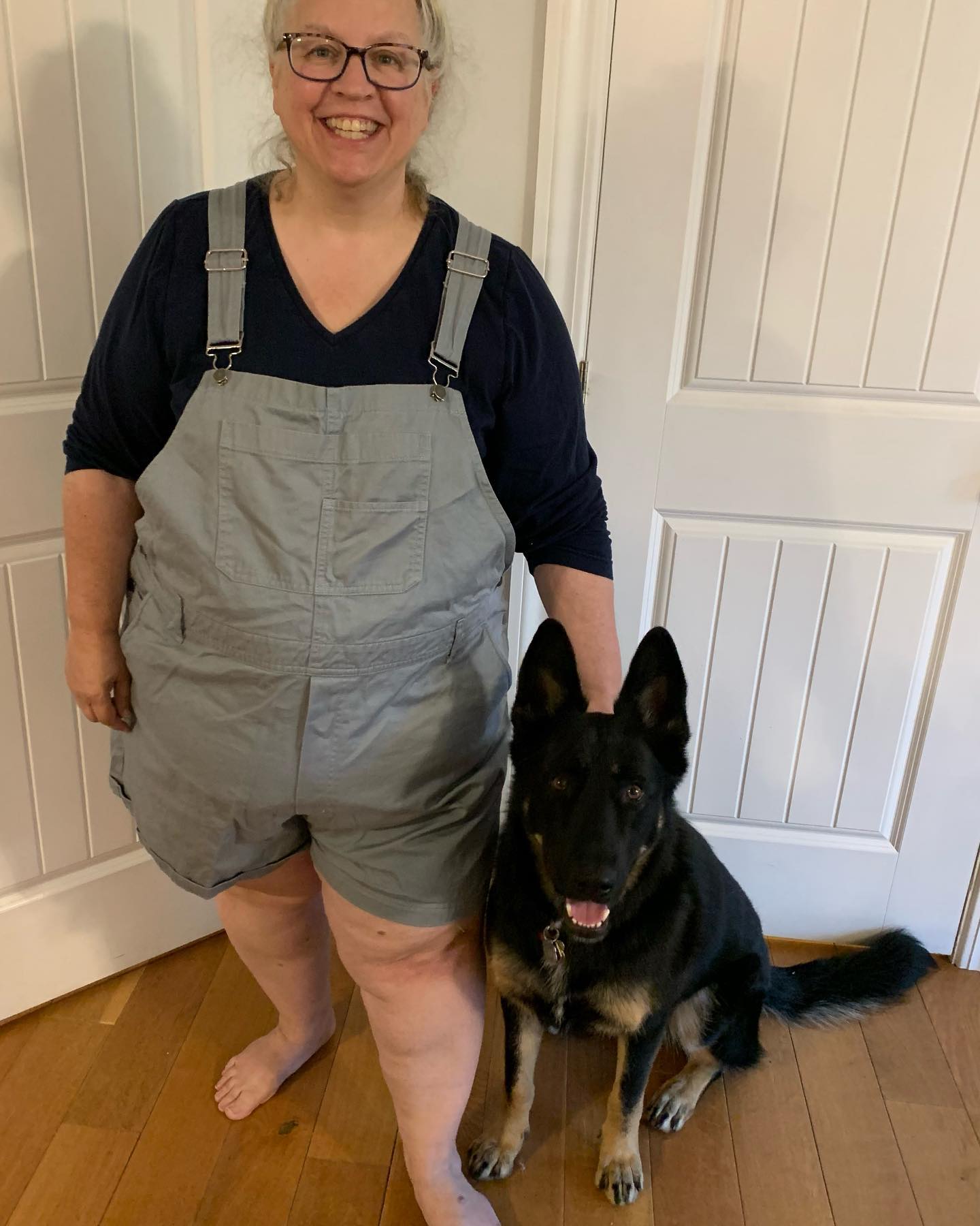 #MeMadeMay2023 wearing my True Bias Riley âshorterallsâ from the Riley overall pattern. Paired with an old self drafted V neck tee which is an old favorite. Joined by Miss Lotte!