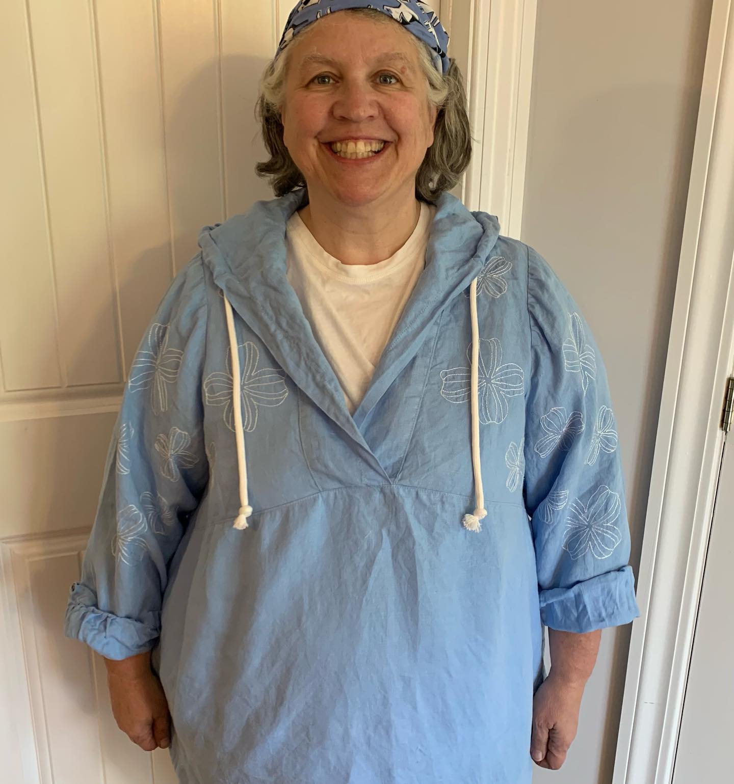 #MeMadeMay2023 day 26, today I am wearing my self drafted linen hoodie featuring machine embroidery that was something I sketched then entered into my embroidery software and stitched out with my sewing machine. Excited for a long weekend with forecast of sunny warm days and breezy cool nights. I love exploring ways to embellish my makes.