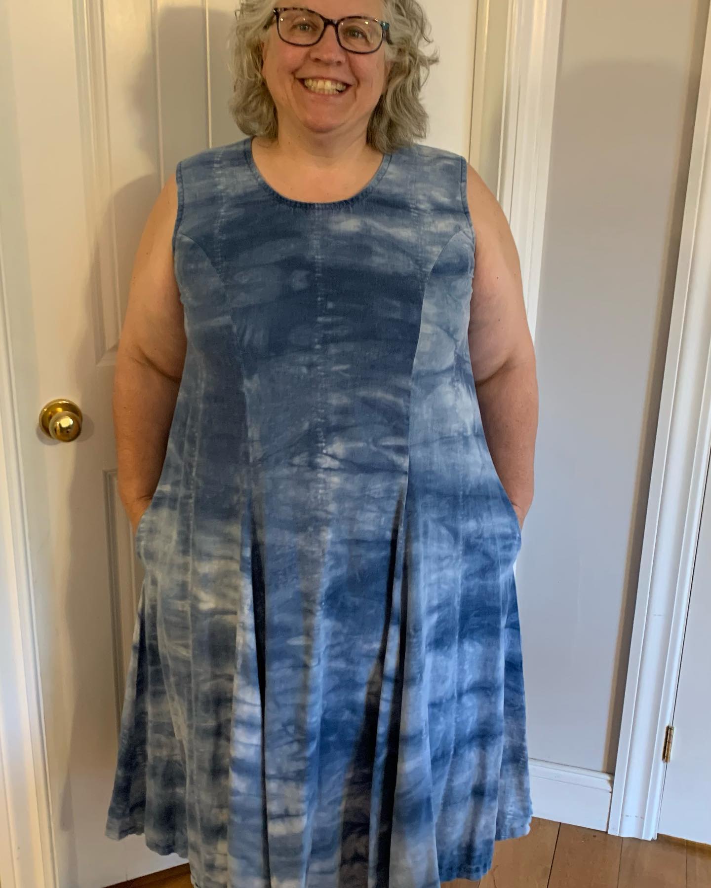 #MeMadeMay2023 day 30, this was an early dyeing attempt using a simple folding technique. This is lovely soft linen. Self drafted princess seam dress with pockets! I have hesitated in the past to wear this out of the house but, today I really like it.