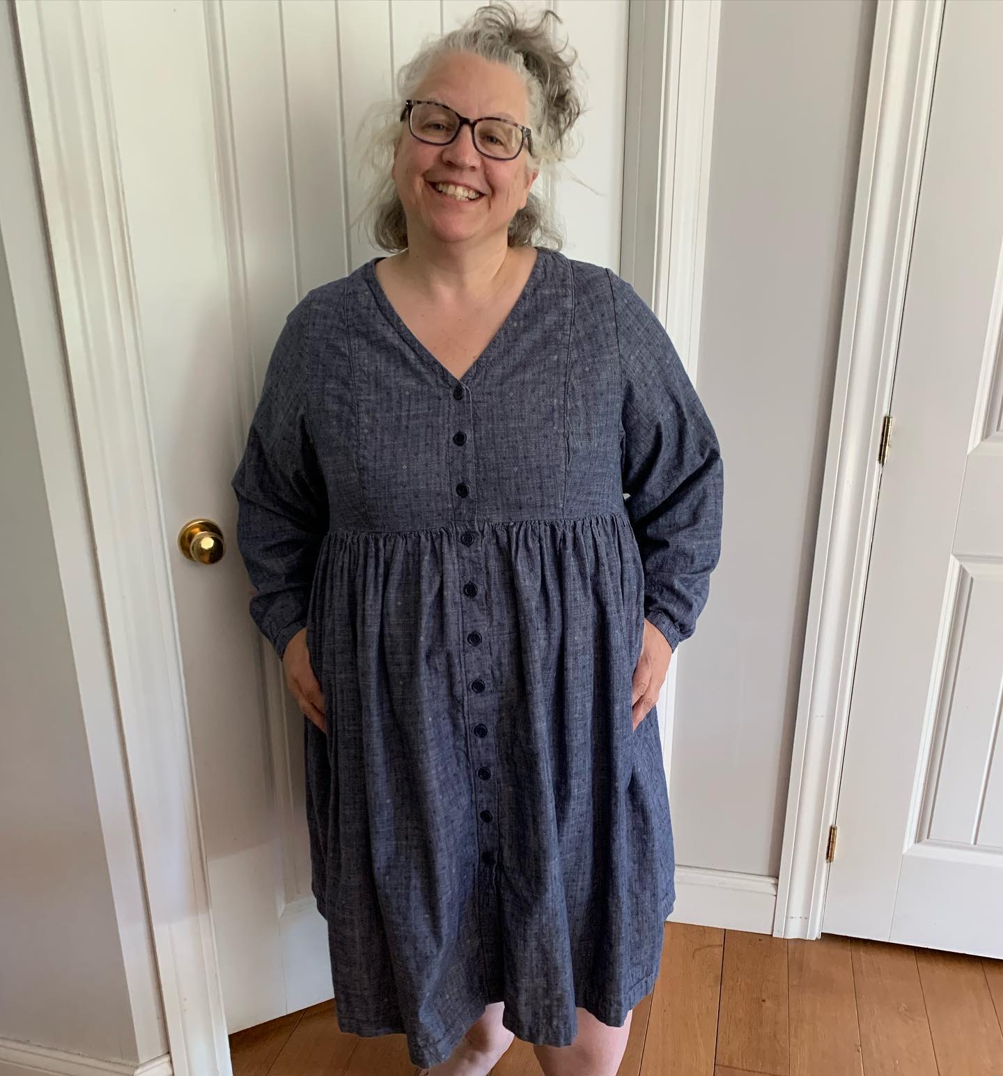 #MeMadeMay2023 day 23 and I am not myself. Today is the story of a beloved fabric gone astray. Using some treasured navy textured cotton I made my tried and true self drafted princess seam sleeveless dress, but I did partial lining of bodice to finish neck and arm holes, and I hate the lining. So this dress gets little wear. But in me made May spirit, I decided that after today I am removing the lining and refinishing with bias tape and this dress will really get worn! The shirt is Cashmeretteâs Vernon shirt with the full bicep sleeves and a bust dart that is still off a bit after 3 attempts but it is a great shirt.