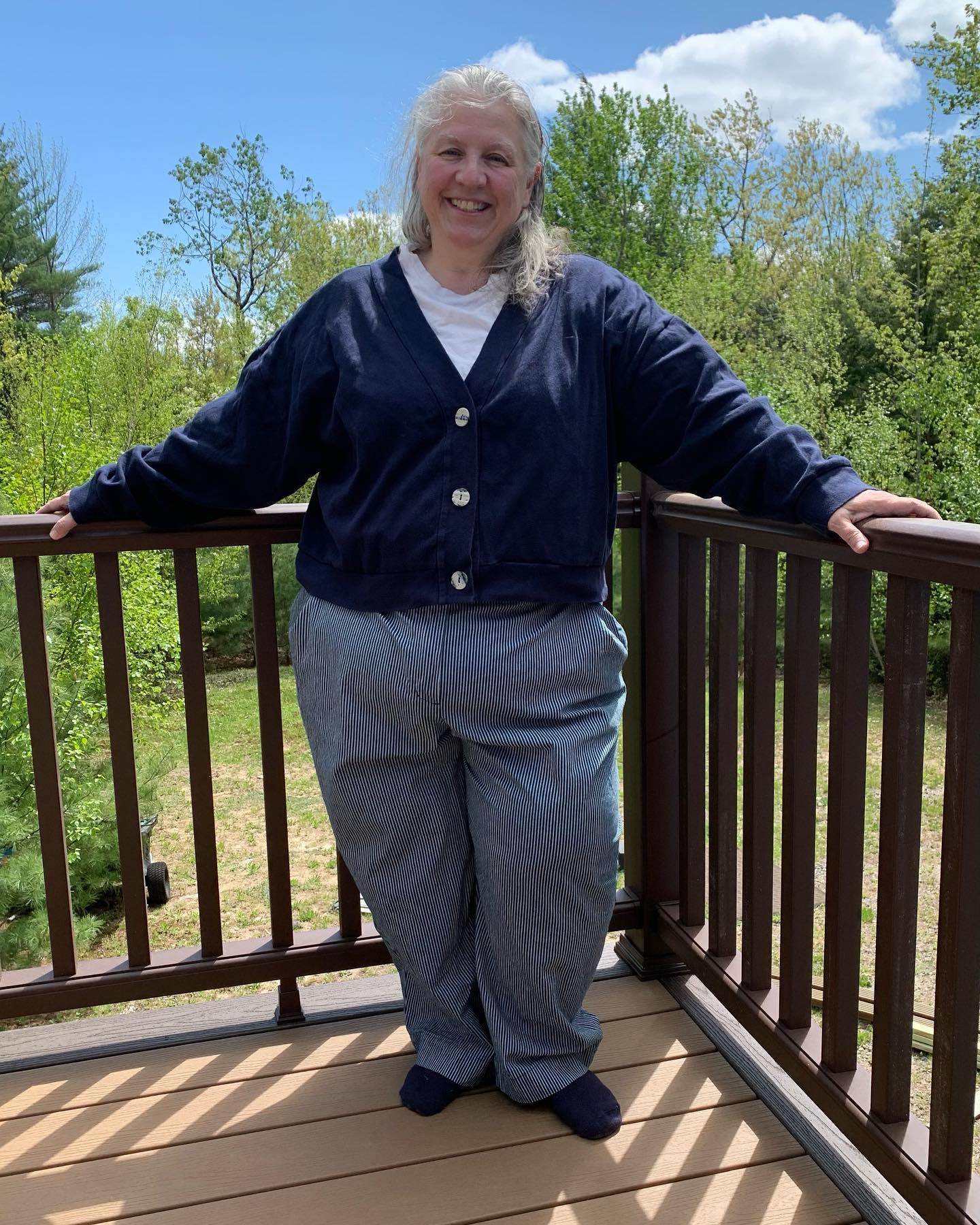 #MeMadeMay2023 day 17, today the sun is shining but it is cold and winds are gusting, so I pulled my True Bias Marlo sweater out of winter storage. I am wearing a favorite rtw tee shirt and Mitchell trousers by Closet Core. Feeling kind of dapper. Only two weeks to go!