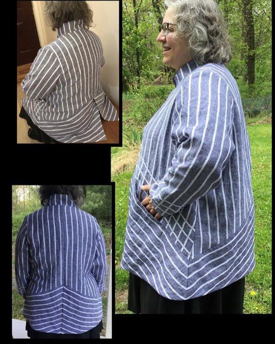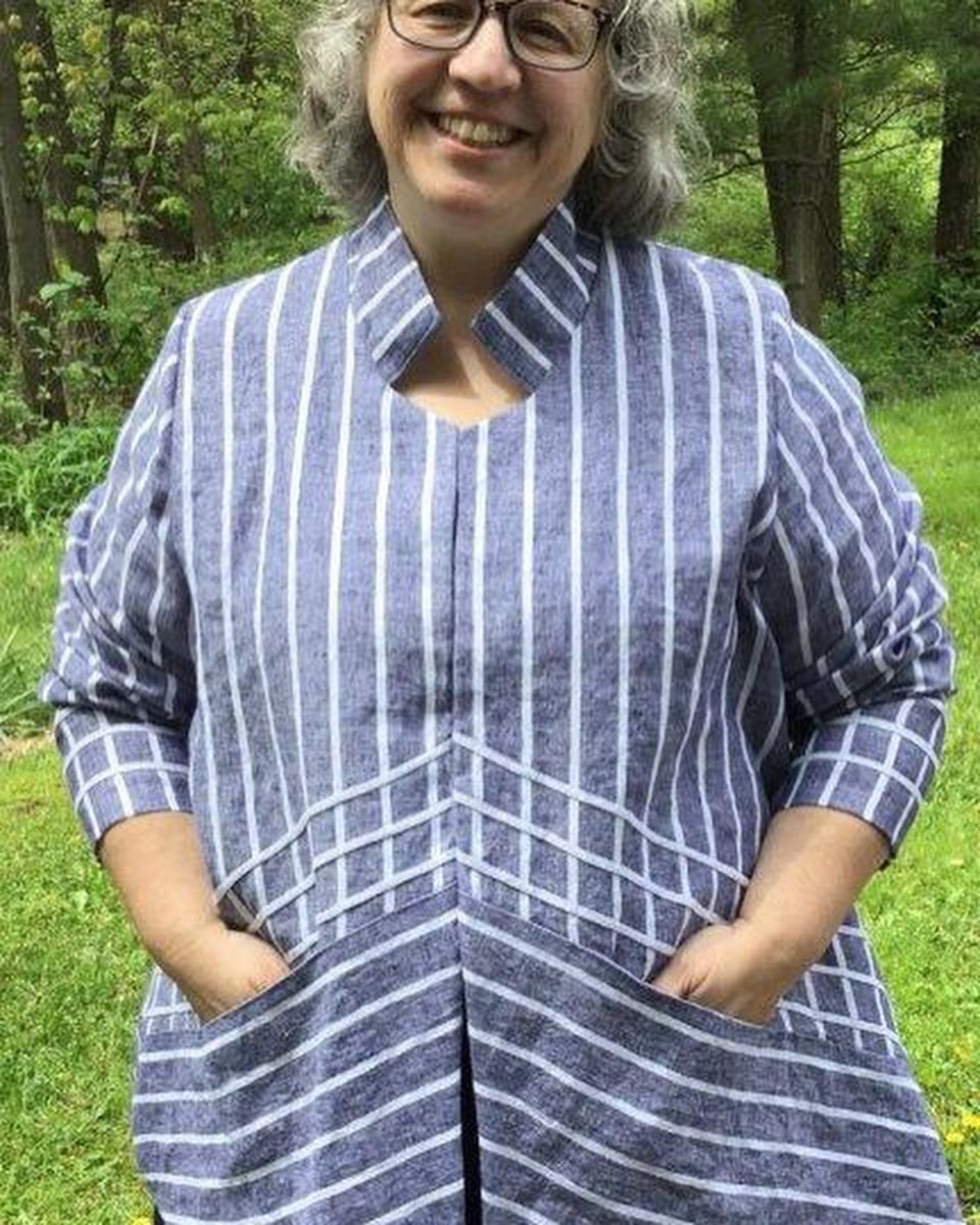 My latest make for Pattern Review’s Round 3 Sewing Bee. The pattern is Tania by Jalie, with max waist 44″ and max hip 54″. Jalie does offer other patterns in more extended sizes. Jalie provided a complimentary copy of the pattern for this challenge. Details on altering the pattern to accommodate my 46.5″ bust, C cup, 49″ waist, and 59″ hips are included in my blog post, at JustCutTheScrap dot Com. #jalie3906 #jaliepatterns #patternreview #sewover50 #sewover50plus #fatsewover50 #pfnatural