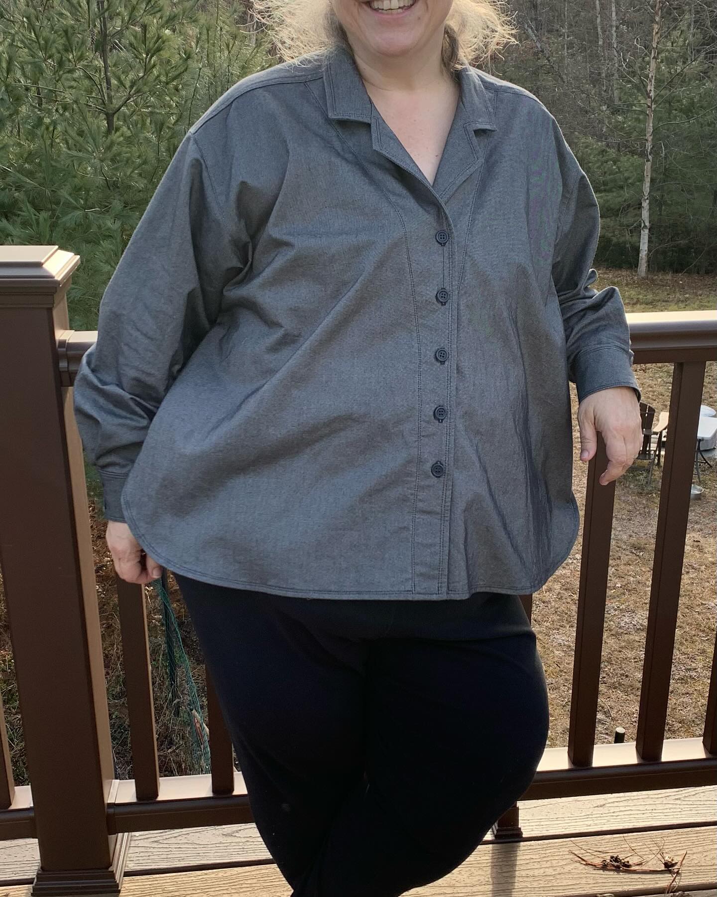 Self care win! The pattern is Daughter Judyâs Genra blouse pattern. I missed wearing my summer version in lightweight linen so I made it in this medium weight brushed chambray. I actually used it inside out to maximize the comfort. I altered the fit a bit to my measurements. I have a relatively smaller bust, large biceps, and several sizes larger waist and hips. Not being a fan of boxy tops, I avoid drop shoulder patterns but this one just falls and feels great on me. The sleeves are both generous but not cumbersome when trying to work in it. I could easily wear tee shirt under it making it a great layering piece. The collar and curved facing are perfectly shaped for my frame. I adore the great hi/low hem with side vents. The back pleat adds just enough room for movement without adding too much volume. In the stiffer fabric it becomes possible to flip the collar up. I double stitched top stitching for an extra detail. Fabric was bought online from Fabric Mart and buttons are from Wawak. No affiliation, just sharing my make. Measurements 46:48:56. #daughterjudypatterns #fabricmart #wawaksewing #pfselfcare #punkfrockers #sewover50december