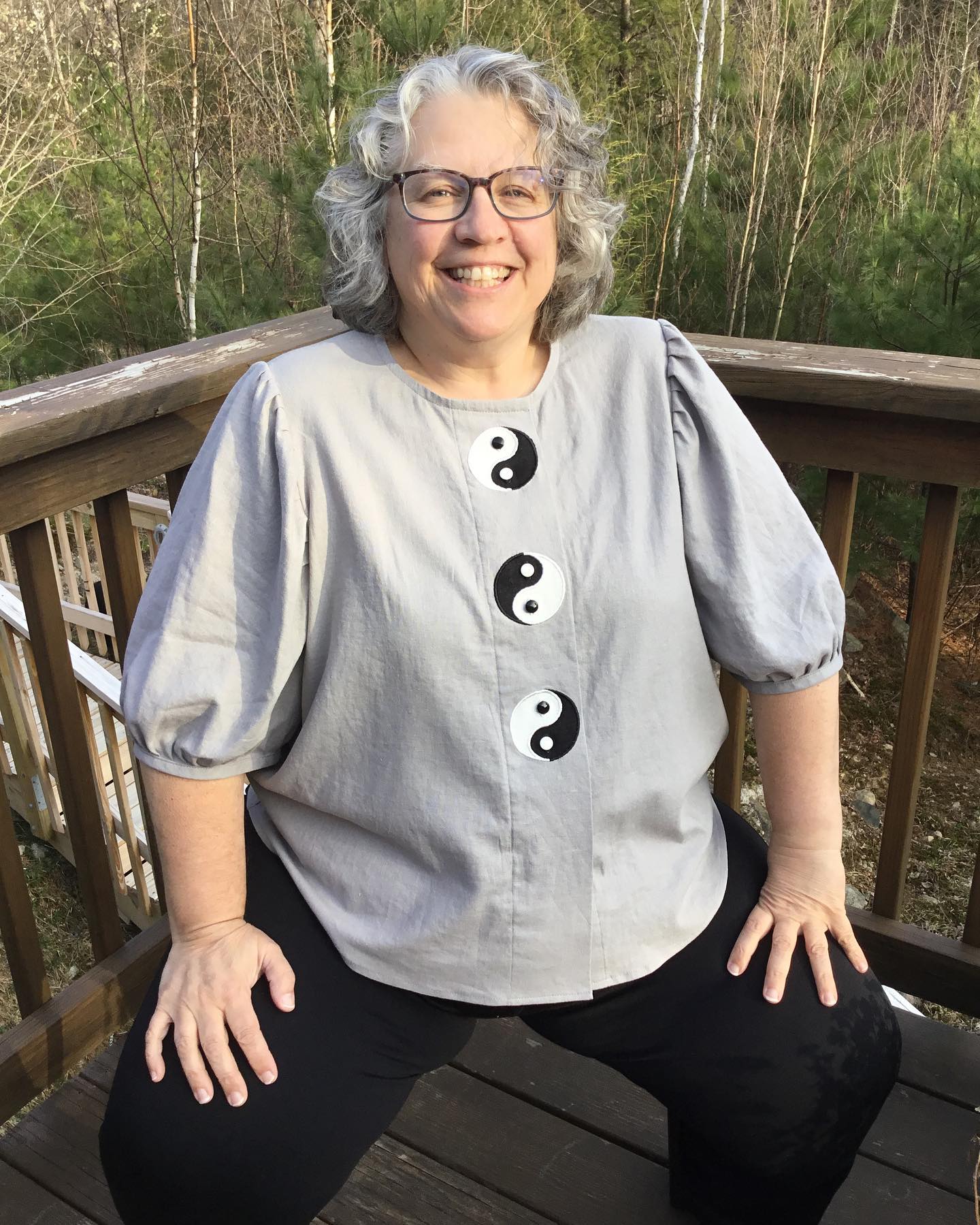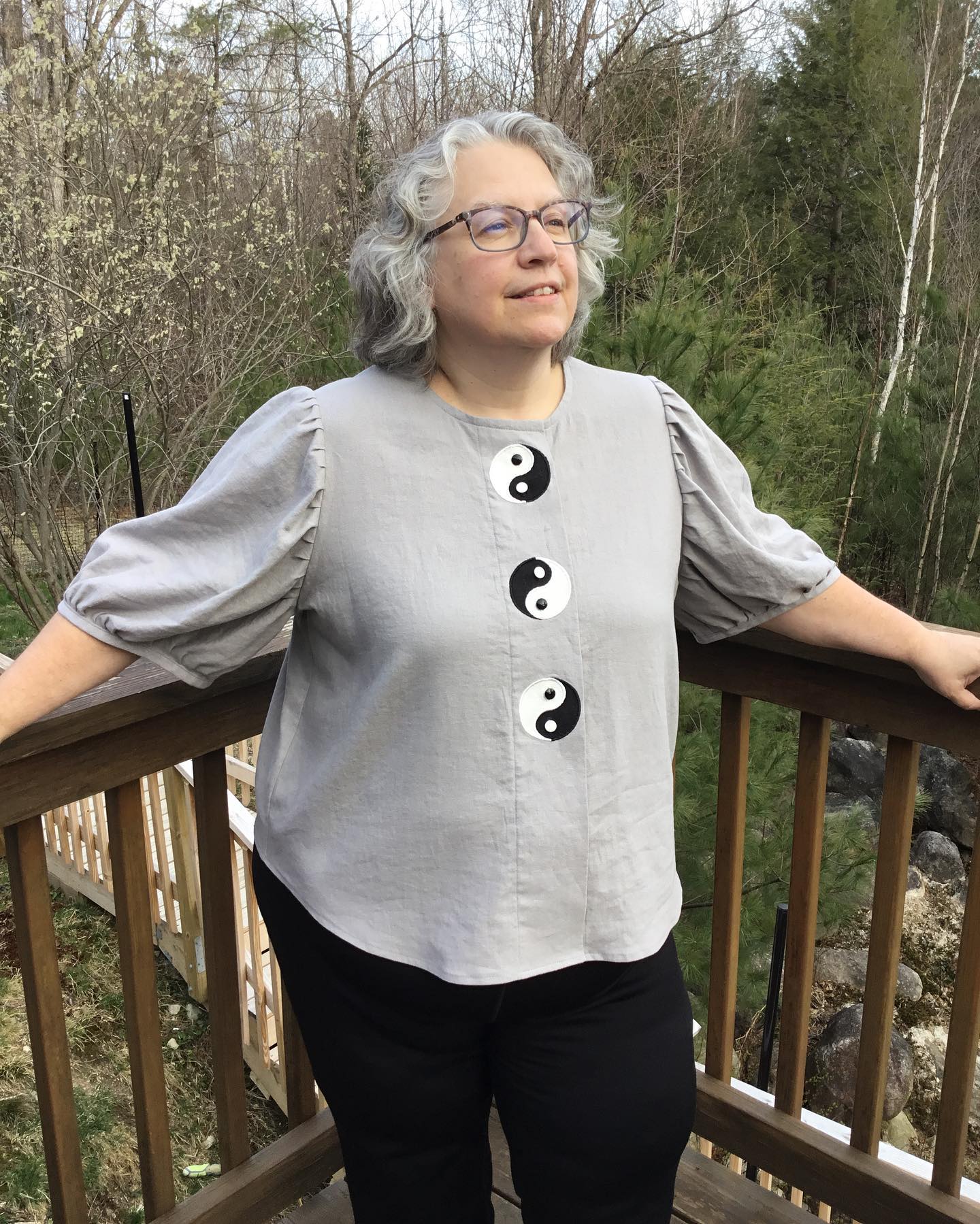 Here is the Anna Allen Athena Puffed Sleeve Top and Dress pattern, sewn size 22, only changed the center button placket for design purposes. I created the machine appliqué button hole design myself. Lovely soft linen. Changed gathers to pleats and used French seam for beautiful inside finish as well. Hidden buttons on inside also. Love this pattern, follow directions for quick and easy sew, or perfect starting point for pattern hacking. It is a tried and true pattern for me. But, sadly not drafted in extended size range, but design accommodates my pear shape. Bust 46â C cup, waist 48â, and 58â hip. #sewover50 #sewover50plus #pftnt