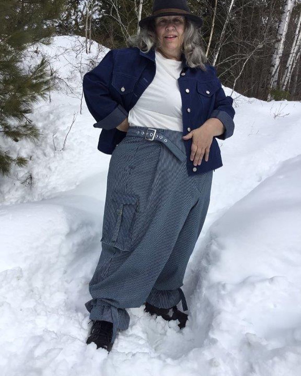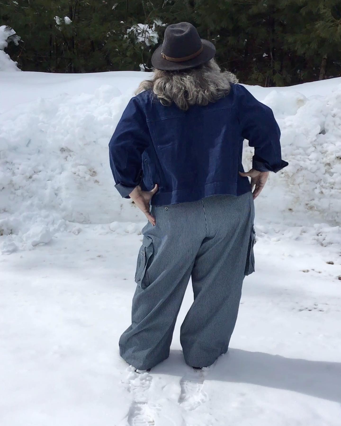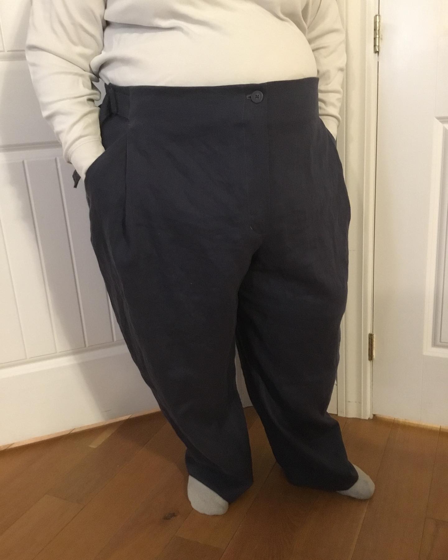 I made the Mitchell Trousers by Closet Core. My measurements are 48 waist, 58 hips, and I am 5â4â. I made size 28, with minor extension to crotch curve. I removed 1.5 inches in length. These are so comfortable, standing, sitting, and moving. The pleats in front of pockets add room while seated. The back darts and welt pockets make the back so snazzy. Side straps allow you to snug up or loosen for those time you want some flexibility. Made in medium to heavy weight linen. No gaping at the back while seated. Construction is interesting. #closetcoremitchell #sewover50plus #weedstowildflowers #punkfrockers
