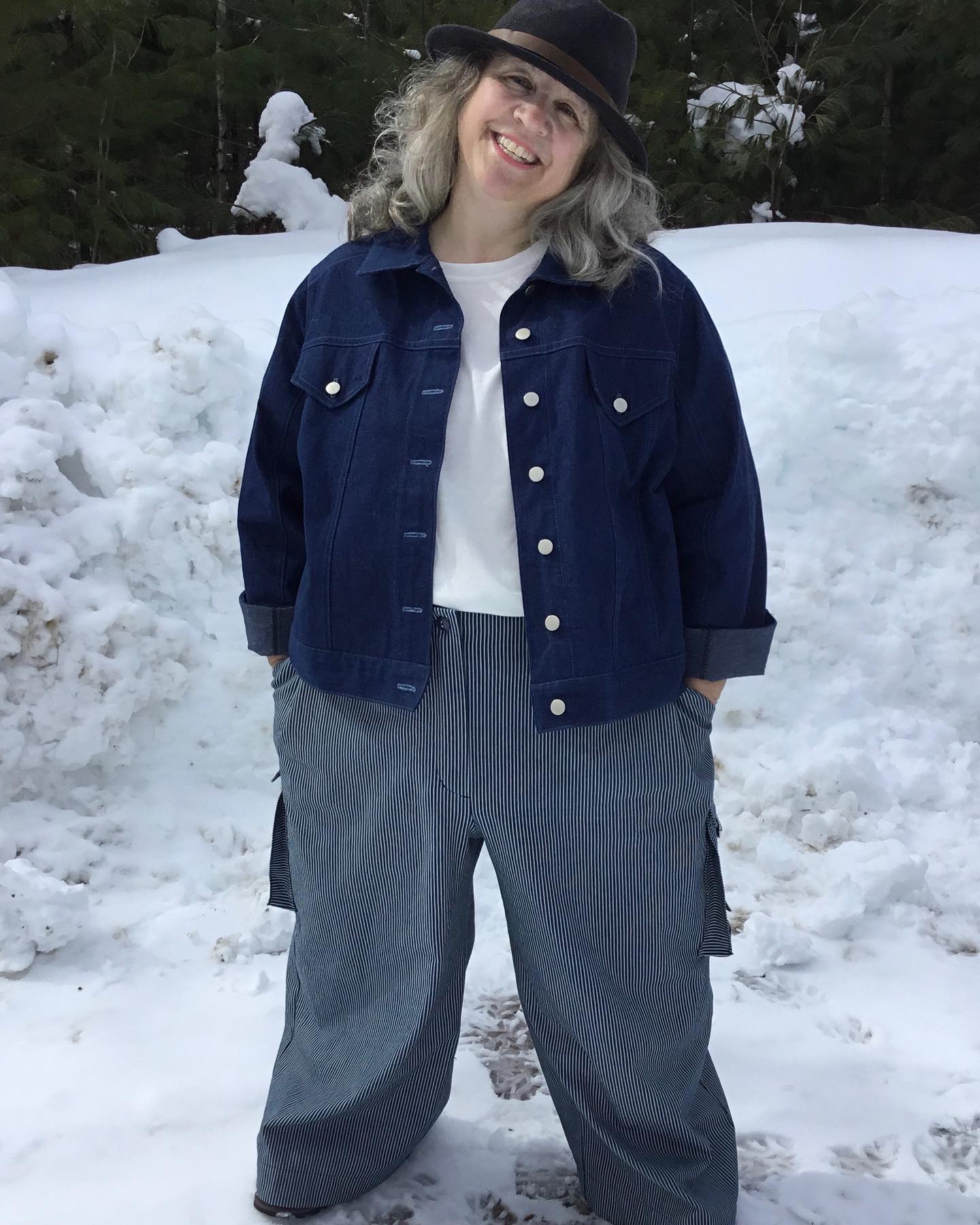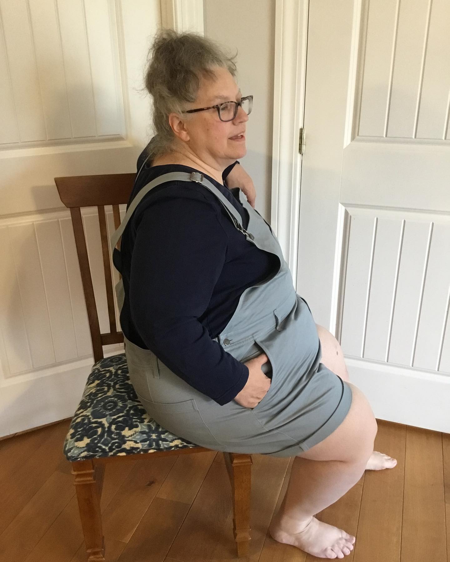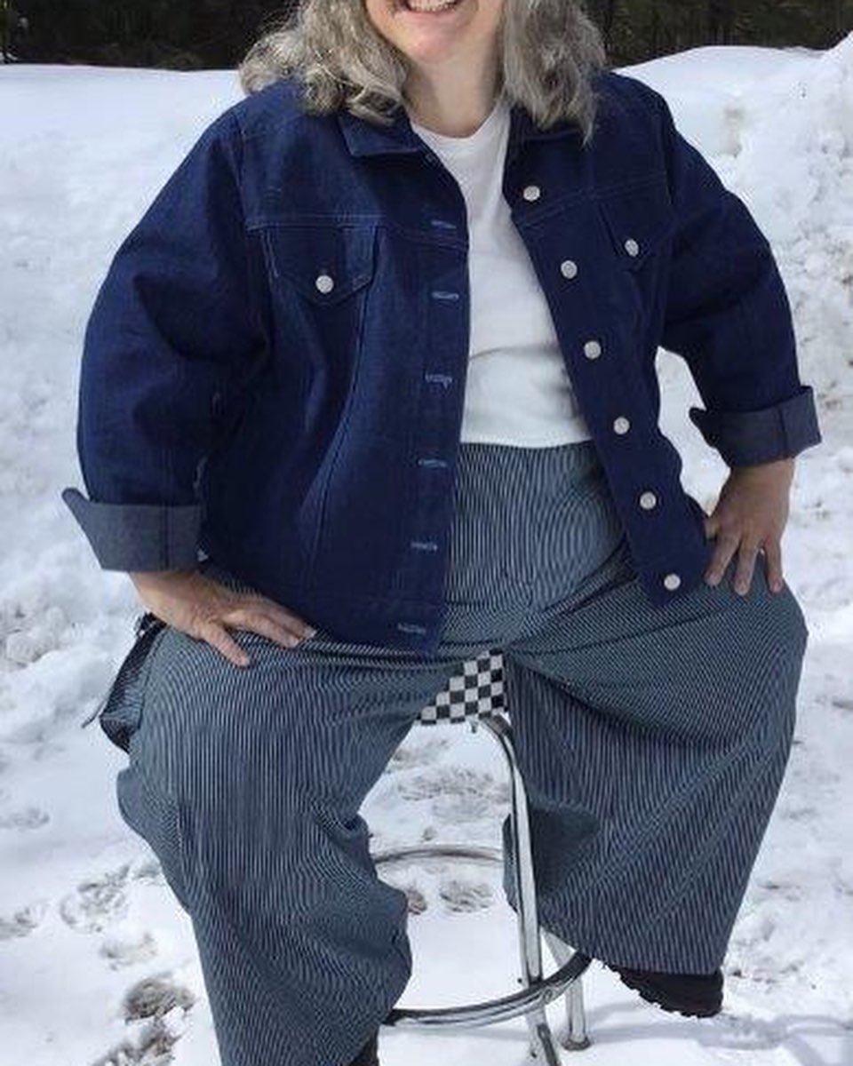 True Bias Riley overalls. Straight size 30 with 1.5 inch total crotch extensions. Heavy cotton twill. Looking forward to wearing these when it eventually warms up. Did all 60+ instructions. It is a lot of work, but worth it. Will reduce bib size and shorten straps next time, but no other changes needed. Just wearing these makes me feel younger. Really pushing my comfort zone with these short overalls, but in a good direction. The Riley 14-20 goes to max waist 59.5â and 61.5â hips. #sewover50plus #rileyoveralls #punkfrockers #pfstretchyourself