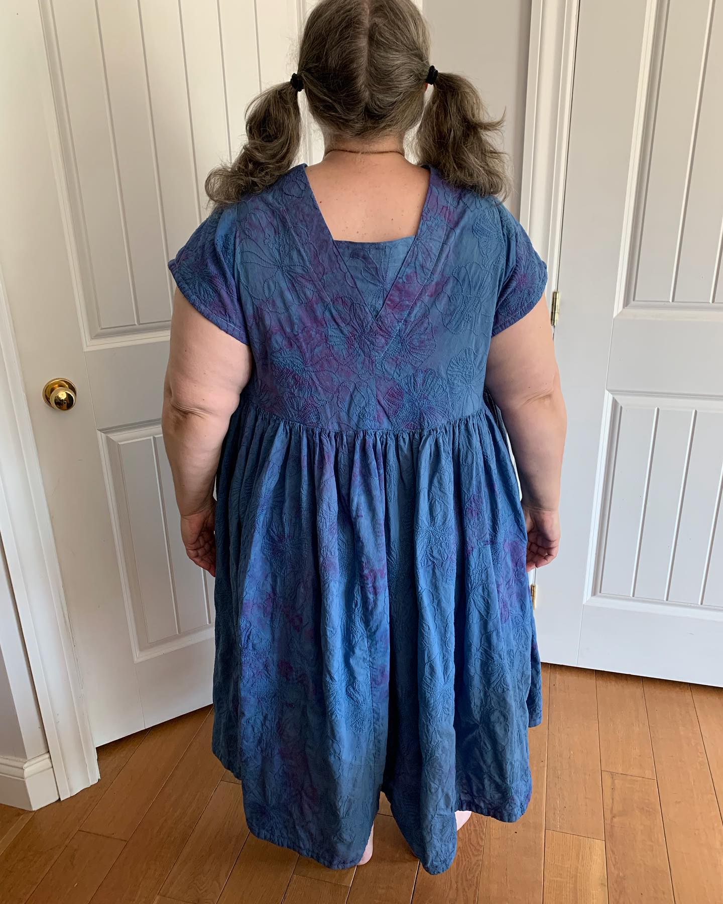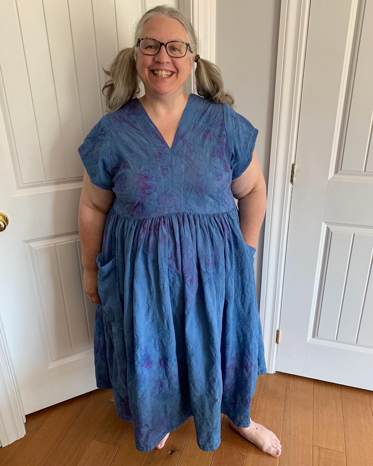 #MeMadeMay2023 day 10, this dress is a textured cotton from I believe Joann Fabrics, which was purchased and iced dyed by Jenny Hassler, and made into a Caramiyaâs Dragonfruit dress, which I bought and reassembled into a dress for myself. I adored the original dyeing but it languished unworn in my closet. Just too much bright white for me to be comfortable in. In an attempt to make me reach for it, I attempted an over dye, but was too heavy handed and obscured the beauty of the original ice dye. That said, I still love it, the color is wonderful and in the sunlight the highlights dance, and now I wear it. Nothing ventured nothing gained. #johassler #punkfrockers #pfsewingadjacent
