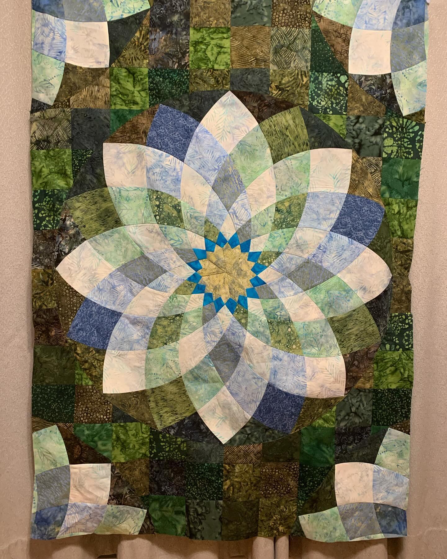 Time to think about borders⦠up until now this is all batiks ⦠I have a lovely non batik that I am considering for a border, but is that breaking a cardinal rule, hmmm, may just do it anyway⦠the quilt wants what the quilt wants⦠lol #quilt #batikquilt #dahliaquilt