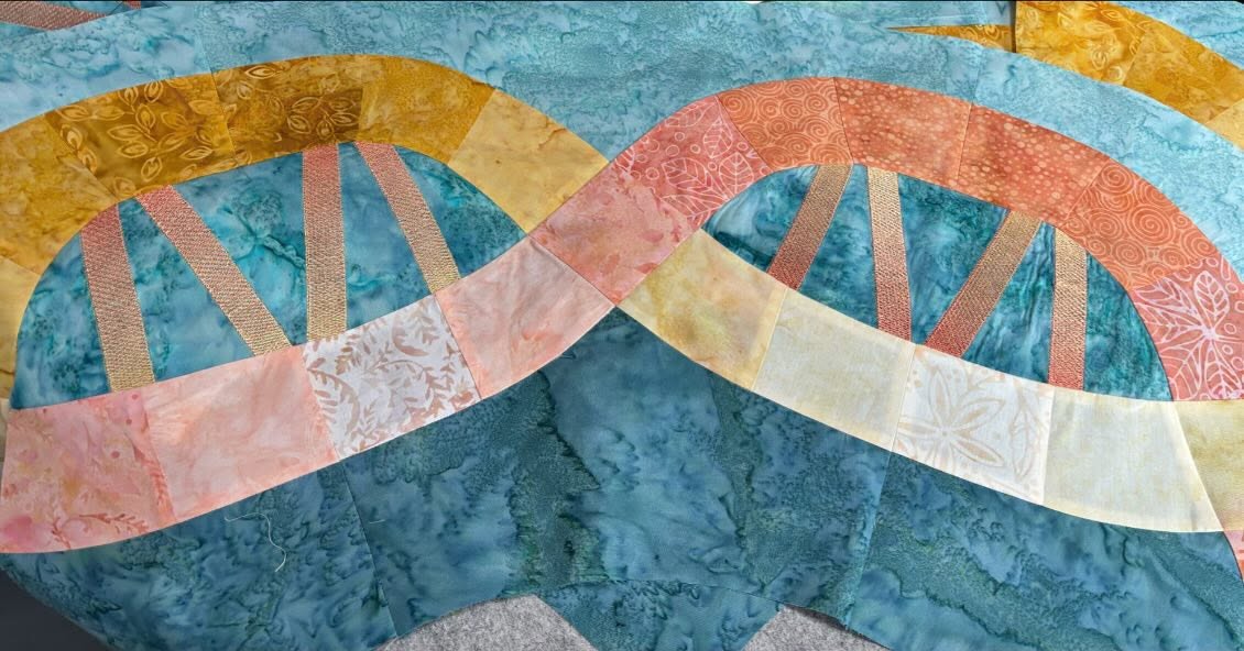 Second border complete, excuse the pins, some assembly still required. Check out last photo for sneak peak(peek) of third and final border, imagine mountains for as far as the eye can see in the pictured fabrics. Loving this so much⦠go challenge yourself and make it happen. #quilting #doubleweddingringquilts