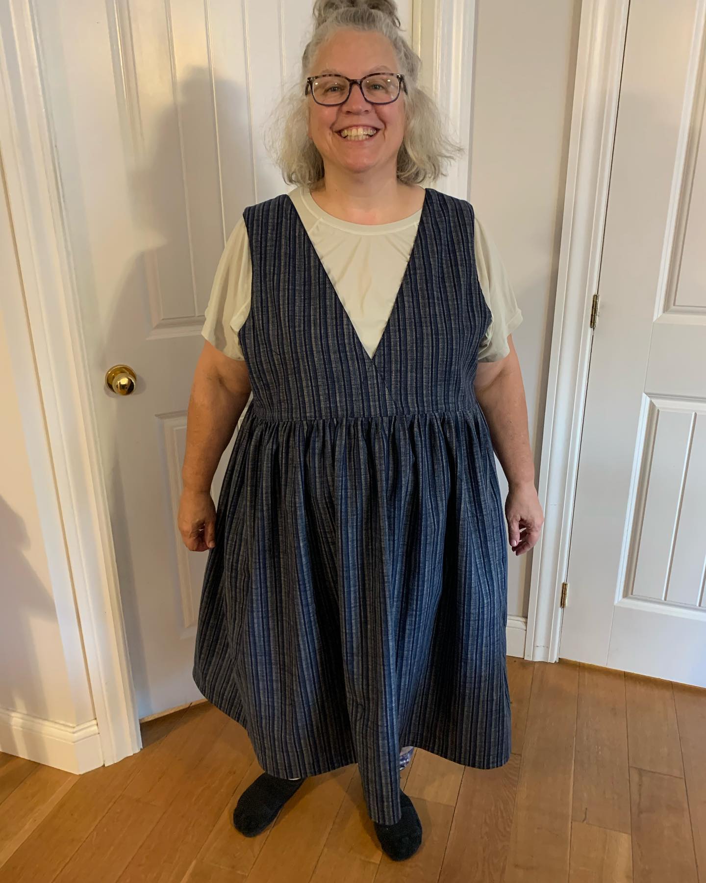 Made a 4 way garment, reversible and can be worn front to back. Hacked the Forager Pinafore by Its Sew Becca. I found the pattern on Etsy. It is more of an apron, which I heavily modified. I just love the deep V and single layer skirt which keeps garment light but still covers me. Size inclusive. Used a Robert Kaufman Sevenberry Nara Stripe Homespun, which I loved both sides. Really beefy cotton. This should be perfect for an upcoming trip! #sevenberrynarahomespun #punkfrockers #sewover50september #sewover50plus