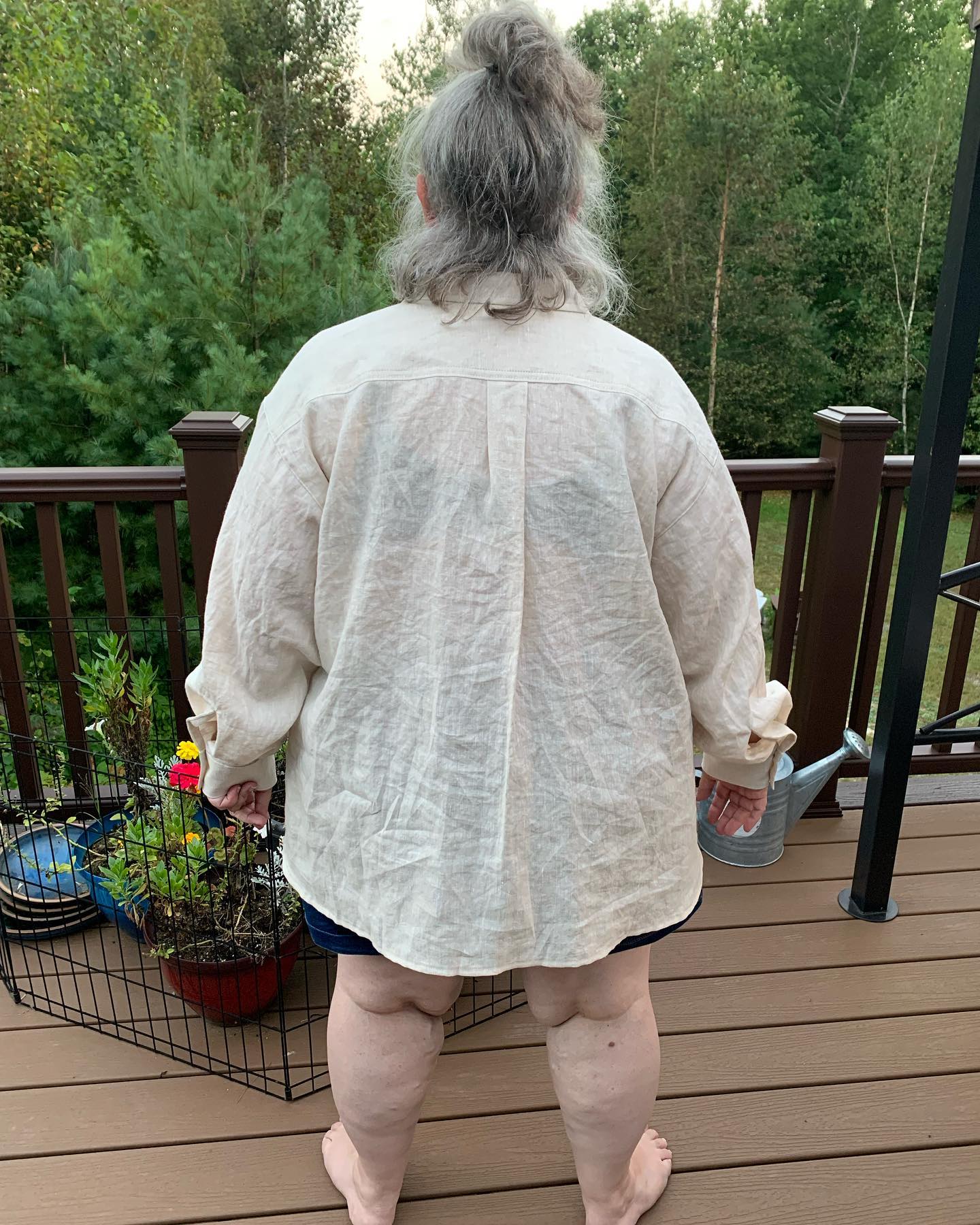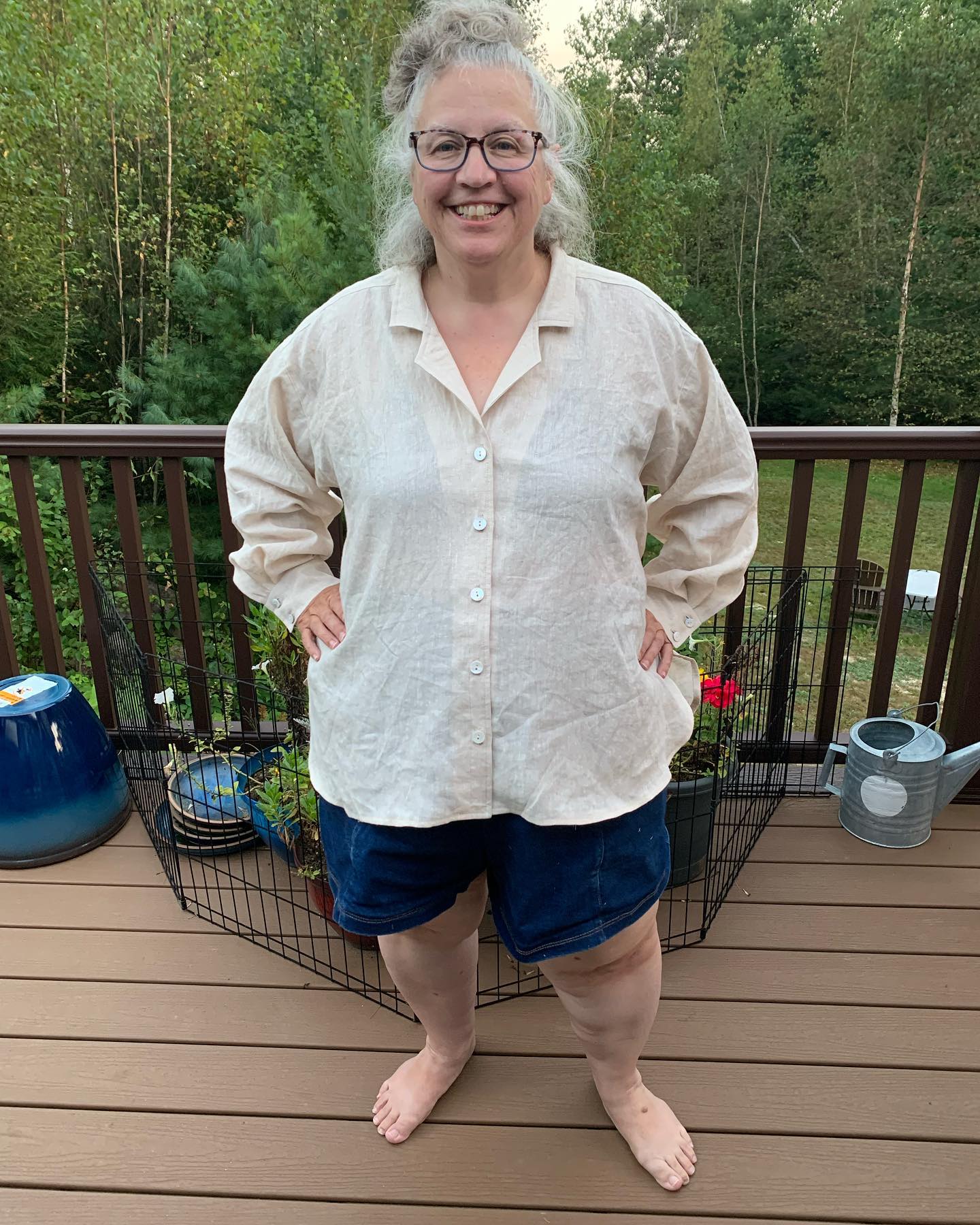 Hot off the sewing machine. Daughter Judyâs Genre Shirt. This is a relaxed and slightly oversized button up with luscious full sleeves and a curved high/low hems. I made 2X bust, sleeves, and waist and then graded to 4X hips. My measurements are 46:47:56.5. There are no bust darts which works on me. Thank you for the inspiration @agatheringofstitches The pattern instructions are good and it is beautifully drafted, and a straightforward construction. Perhaps not the right pattern for a first time button up shirt. Already planning a second in a tencel denim chambray and I might downsize the next one.