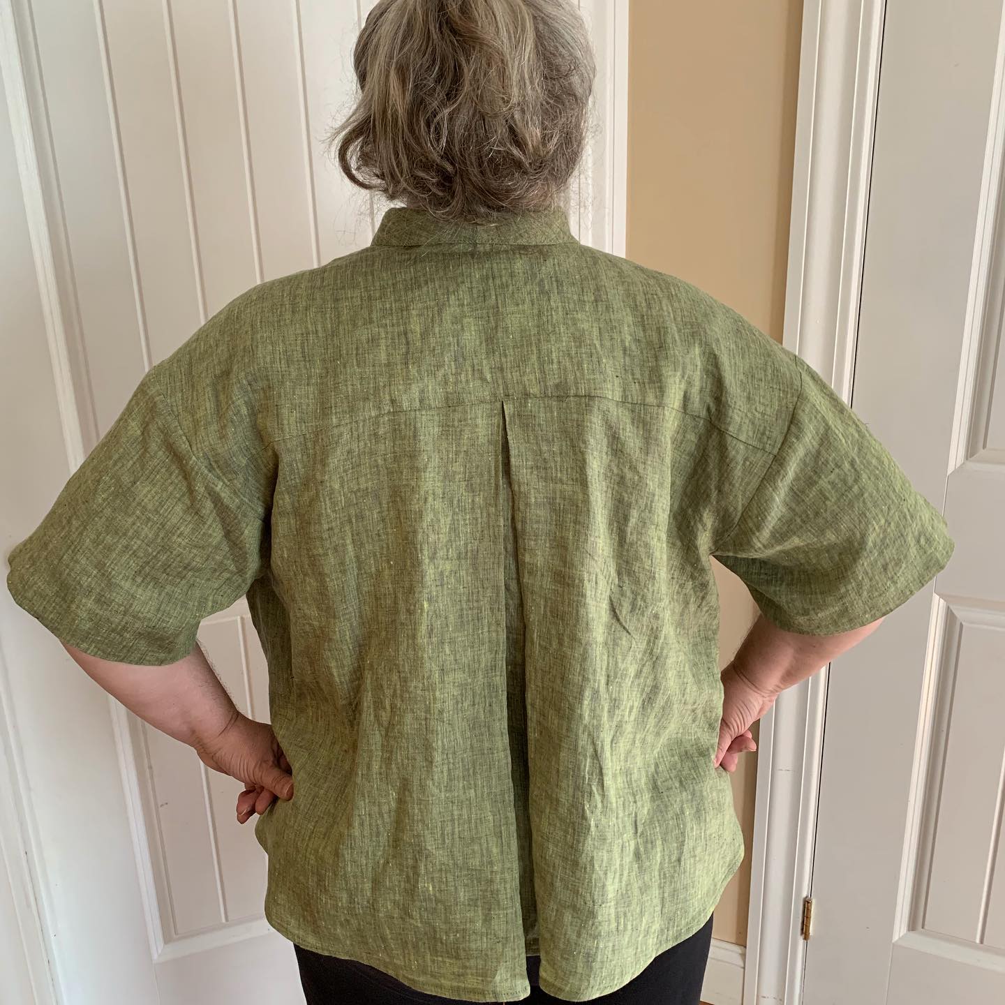 Last short sleeve shirt of summer. It is too cold to wear now, but I will put in my closet, and every time I see it, it will make me think of warmer days to come. This is Eleanor Blouse by Sew Me Something. It is trapezoidal design, which fits my pear shape perfectly. No grading! I made straight size 20. The only thing I did differently was increase depth of back dart, as I had extra fabric, and it was cheap insurance in case the bottom needed extra ease. I also added a 6th button. I think I would have been okay without the modifications. The sleeves accommodate my larger upper arms without needing adjustment. I adore the shawl collar.
