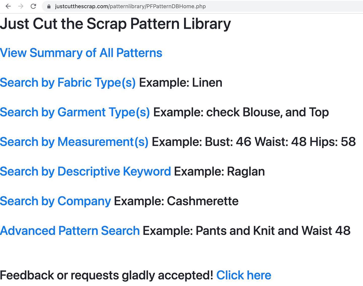Announcing JustCutTheScrapâs Pattern Library, catering to patterns with extended size ranges. Search over 250 patterns from over 80 small indie pattern designers. Search by fabric, measurements, garment type, and more. Adding more patterns everyday. No affiliation with any pattern company. This is a pattern library provided free of charge and at will of justCutTheScrap.