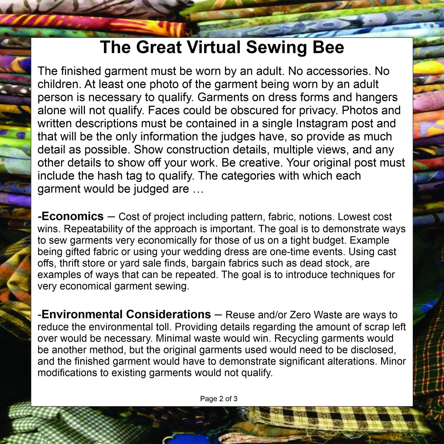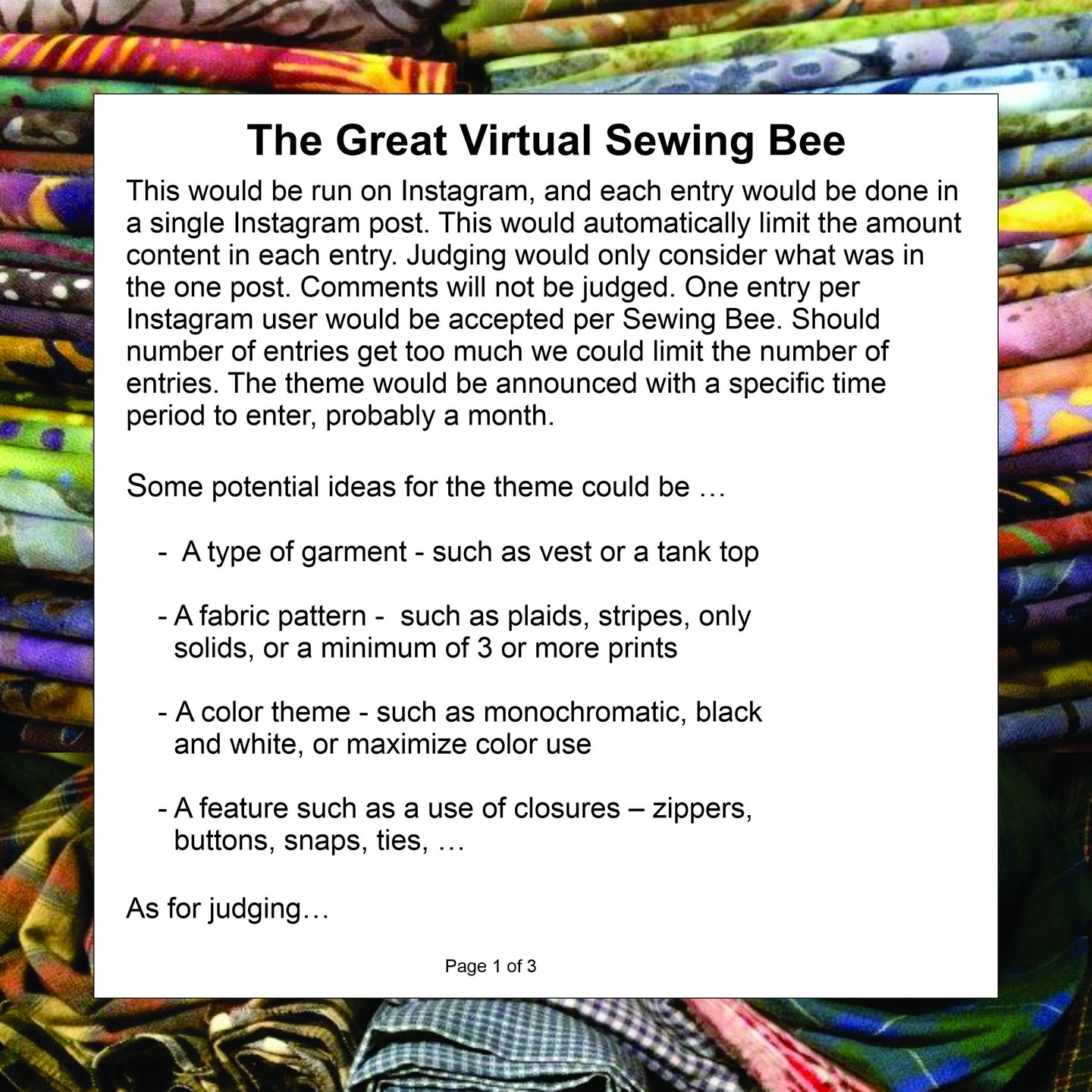 #TheGreatVirtualSewingBee I love sewing, especially garment sewing. I want to encourage more folks to sew garments. But, I also would like sewists to consider the environment, the economics, and the inclusiveness of the sewing industry. Of course quality of construction and originality will always be part of any competition. I want this to be lighthearted and fun, and accessible to as many folks as is reasonably possible. This is my first proposal. This is going to be a lot of work. Any ideas to share? Anyone want to help make this happen? I think this could be really fun. DM me.