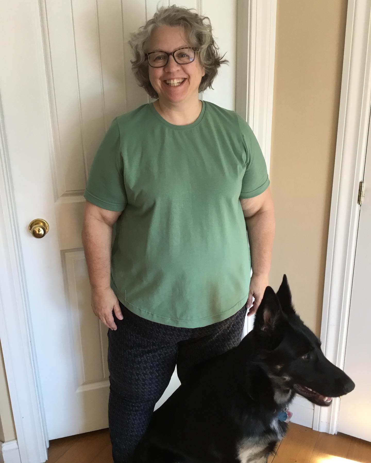 This is Apostrophe Patternâs MyFit Tee shirt in KnitFabric.comâs cotton Lycra – maroon. After entering many measurements, a custom pattern was generated to my specific measurements. I choose relaxed fit with low crew neck and long sleeves. Really gorgeous comfortable fit. I used my double fold knit binder attachment on my cover stitch machine for FIRST time. After an entire day of experimentation and practice, I ended up with a passable neckline. Measurements are C cup, bust 46, waist 49, hips 57. #pfbondage #fatsewover50 #sewover50plus