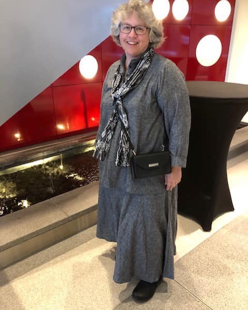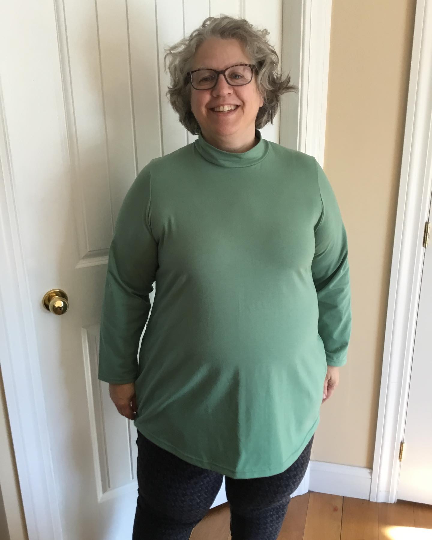 Here is the True Bias Marlo Sweater, in double cotton jersey knit. I down sized several sizes, did no grading. I made straight size 24. My measurements are 47 bust, c cup, 48 waist, 57 hips. I will make another with a more structured knit, and perhaps another size smaller. This is incredibly comfortable, and I love it for a layering piece. It was my first time doing buttonholes and topstitching on such a super stretchy knit, and I struggled. I did interface as instructed. #sewover50plus #fatsewover50 #truebiasmarlo