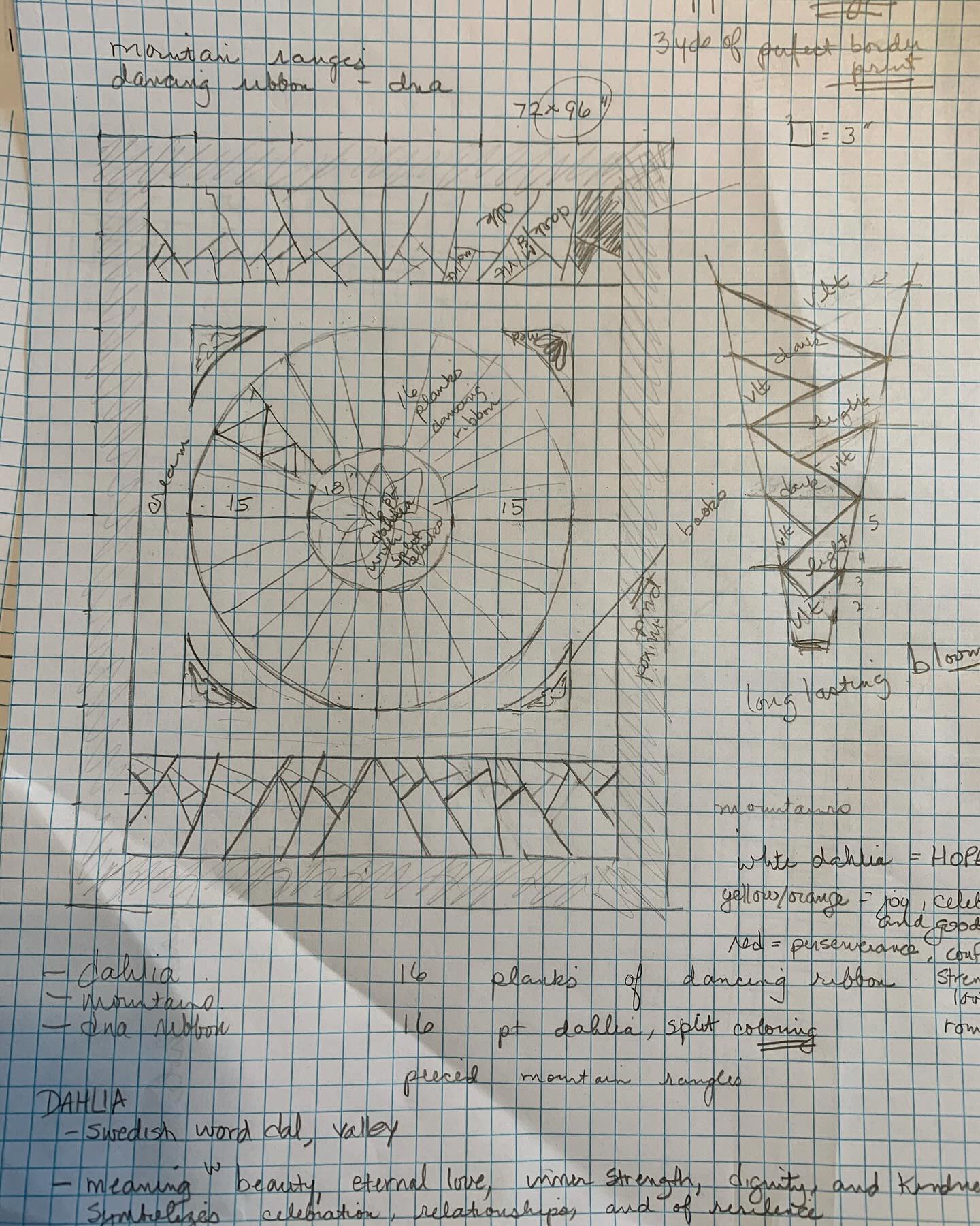 Where to begin ⦠When I start a quilt, I think about the recipient(s)⦠this helps with color and meaningful motifs. In this case, the center features a Dahlia flower which represents joy, hope, celebration, strength, ⦠encircled by a self drafted DNA inspired border. There are mountain ranges and other hidden motifs. There is space to rest in between⦠Then I color my sketches and start drafting pattern pieces⦠all this before I ever touch the fabrics⦠Such an exciting start to the process.