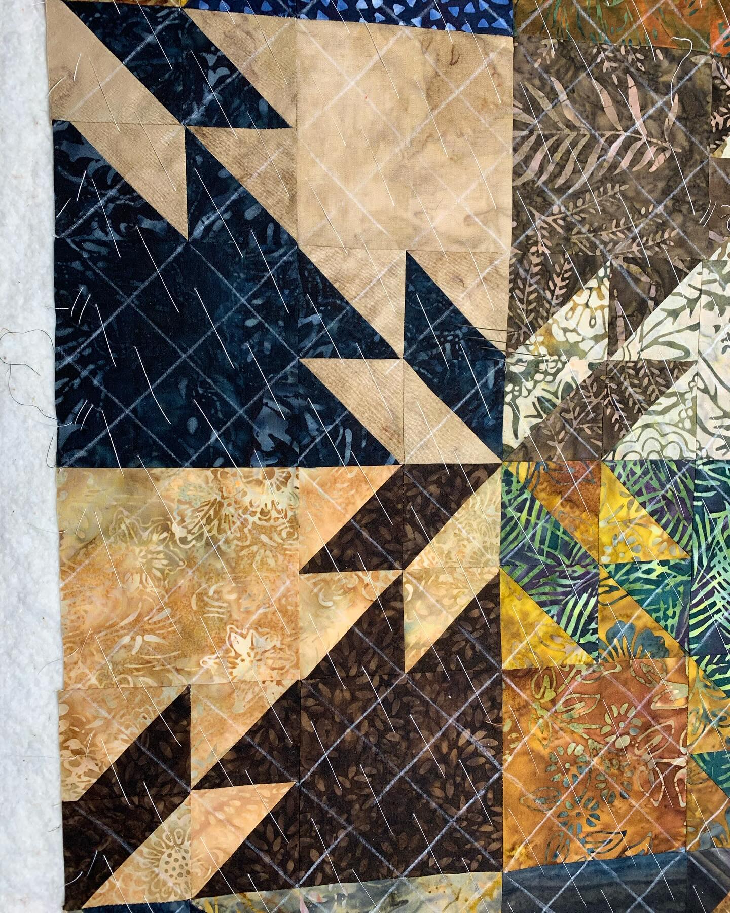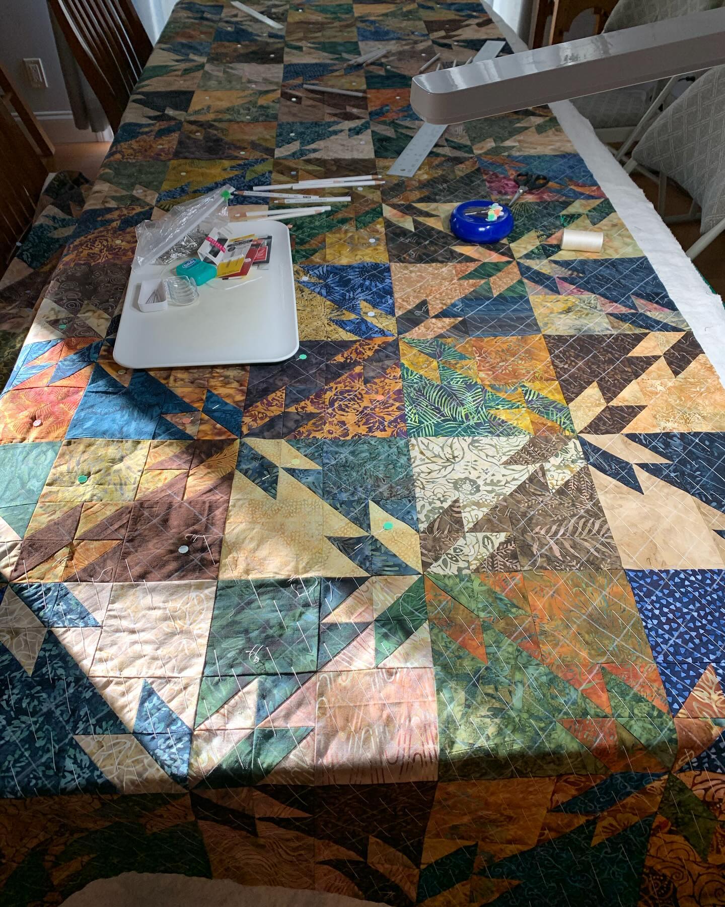 Thread basting and marking to prepare for machine quilting. I remember now how much I love making quilts. The many steps and different techniques along the way. Taking the time to get it right but not aiming for perfection. The opportunity for quiet reflections. The feel of a quilt coming together is so rewarding. I am grateful to be able to create! This is king size, with 8 inch finished blocks, placed 12 by 14 for a total of 168 blocks. Should be 96 x 112 inches. Warm and natural cotton batting and solid 108 inch wide cotton backing. It is a bit of a beast to move around. Thank goodness for my upper body workouts.