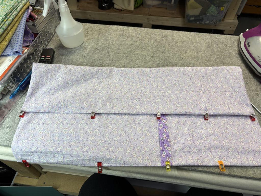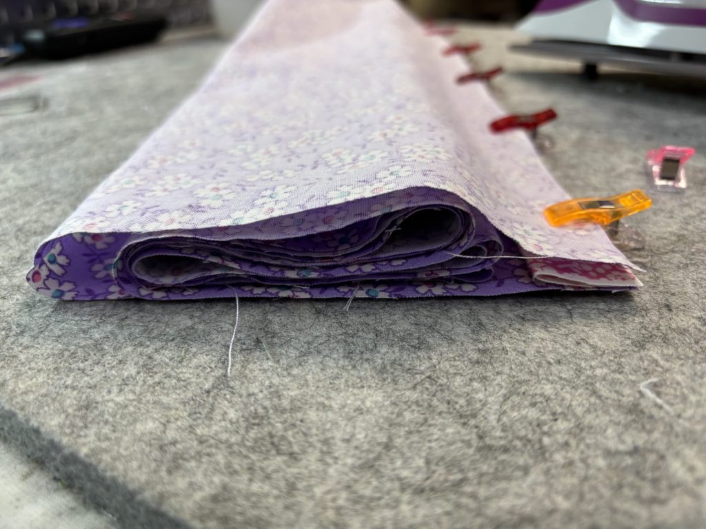 Pull the inside rolled fabric out and you should have a long piece with one end double hemmed and the other end has a decorative end with a wide cuff and optional flange. Press the cuff on both sides.